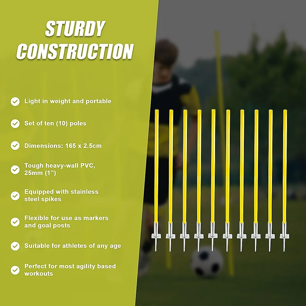 Our agility training set consists of ten 10 x 165cm slalom training poles that will help prepare you for even the most challenging soccer or rugby meet. Our poles are built to last. Made from the toughest heavy-wall PVC, the ability slalom training poles are 2.5cm in circumference and feature a non-rust metal spike for easy insertion into any turf.