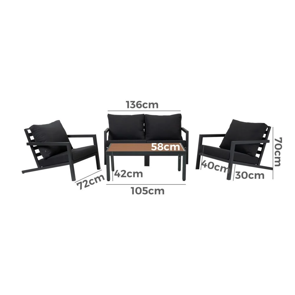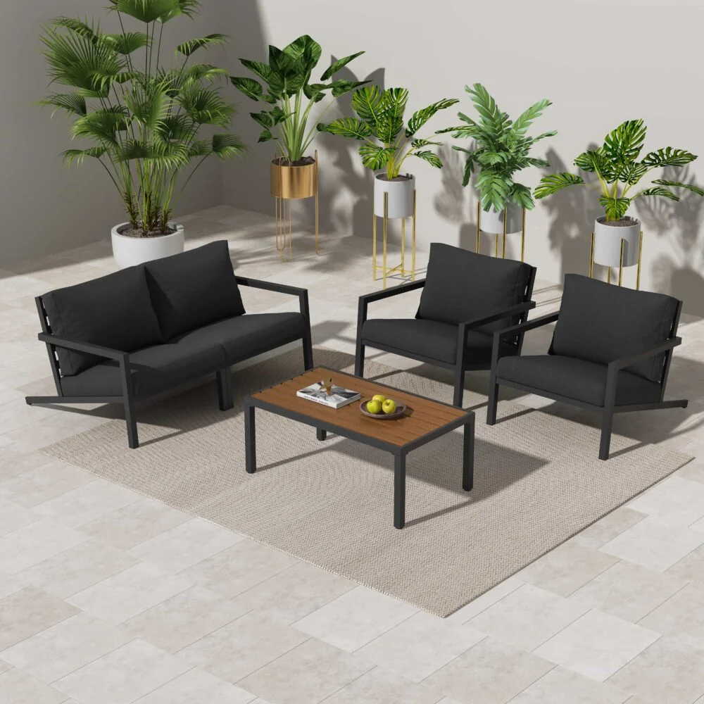 This sofa set is flexible to assemble so you can match the combination you want. It also includes a slatted top coffee table made of matching aluminum, which not only provides functionality but complements the modern appeal of the set.
