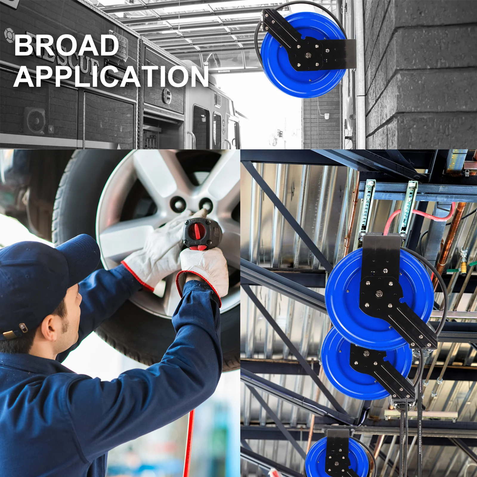 This Dynamic Power Rewind Hose Reel is a new Concept in Hose Care. It's Neat and Tidy and can be Mounted on the Ground, Wall, Overhead or on your Vehicle. This Air Hose Features Heavy-Duty Steel Case, Positive Rewind Action, Auto-Lock and Full Flow Swivel. It also features as 300PSI Air Hose which can be used for most of the Air Tools. This is the Perfect Addition to any Garage or Workshop that needs to keep their Air Hose Clean and Tidy.