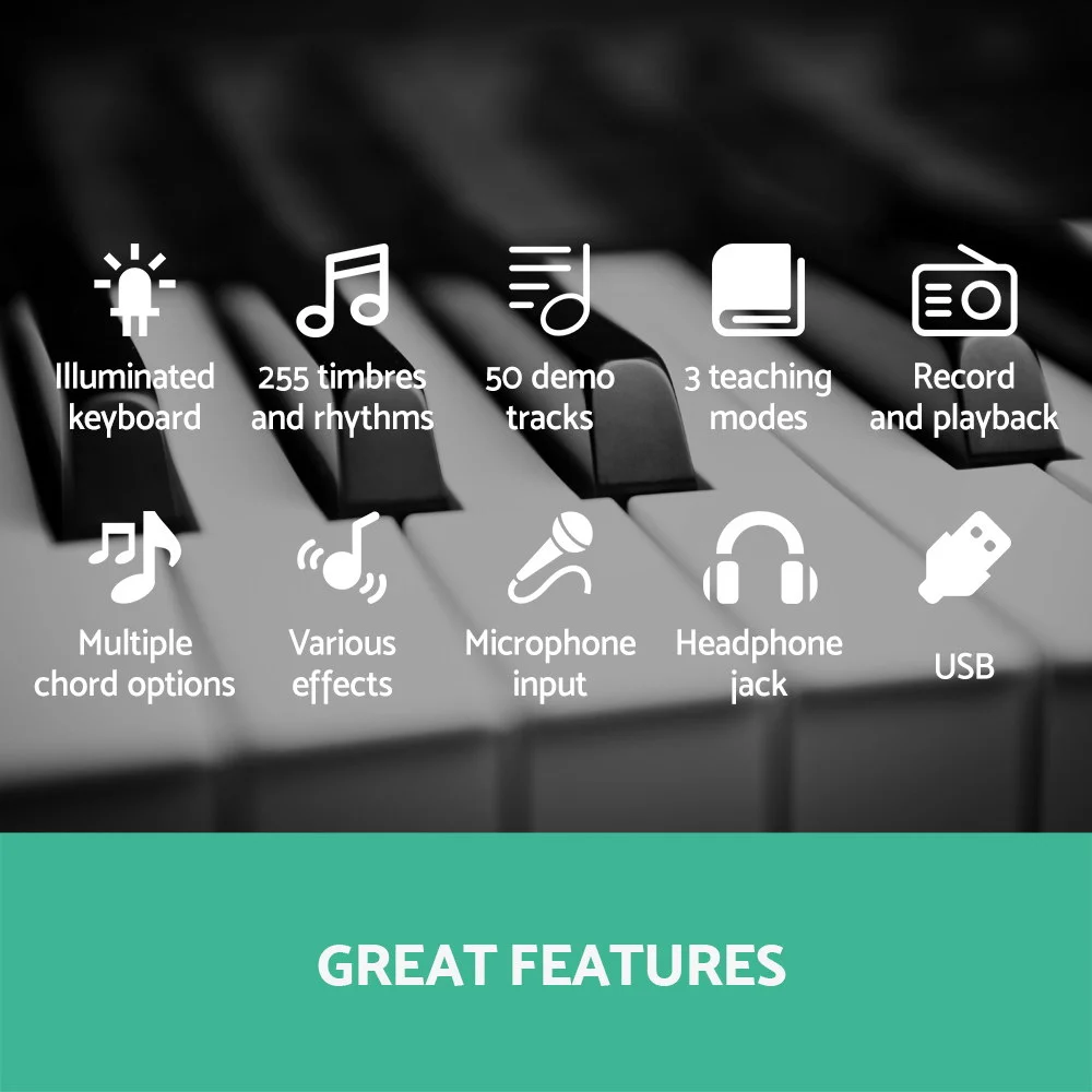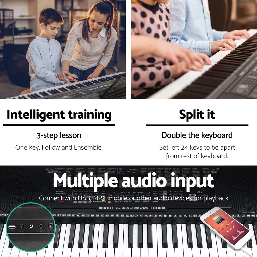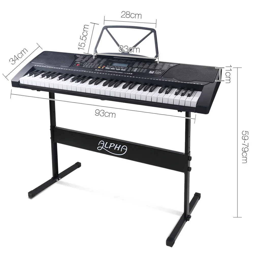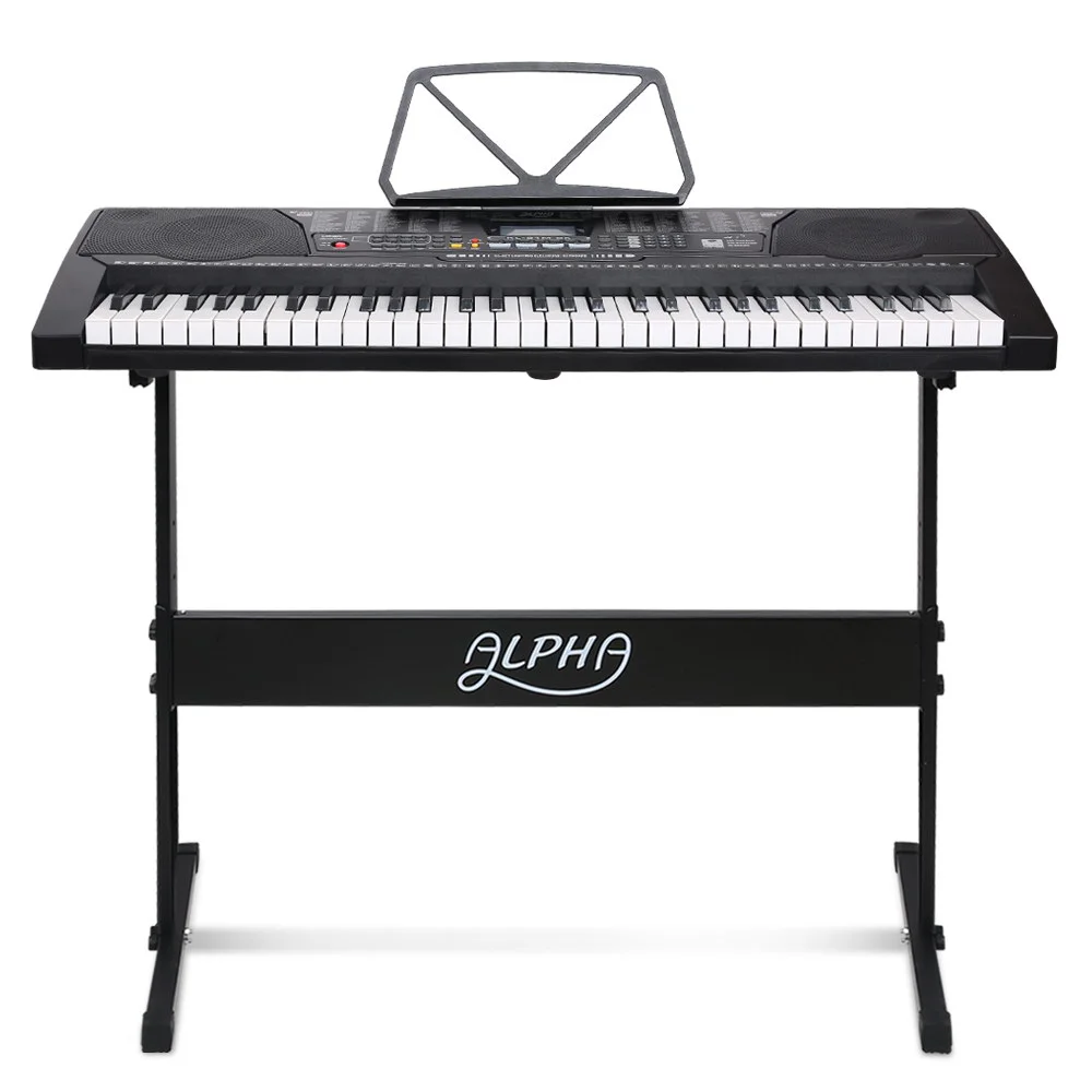 With 61 full-size and lighted keys, the Alpha Portable Keyboard enables you to discover a whole new world of music with some of these exceptional built-in features: 255 rhythms, 255 timbres, tempo and volume control, 50 demo songs, multiple chord options, various effects controls, 61 percussion selects, keyboard split, record and playback, and many more. You can programme the Keyboard to assist with your compositions and the 3-step intelligent training function helps you to learn to play better with minimum fuss.