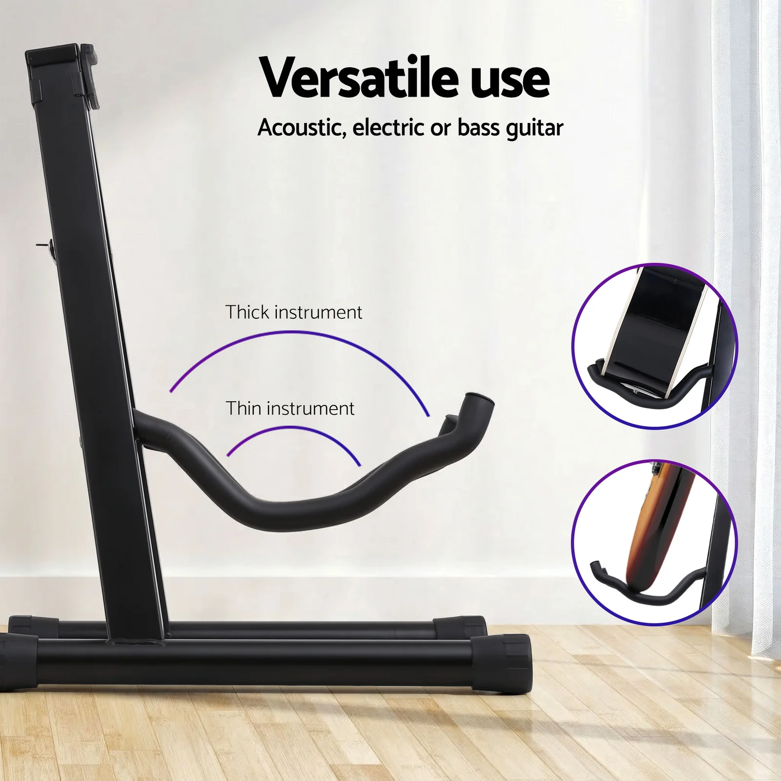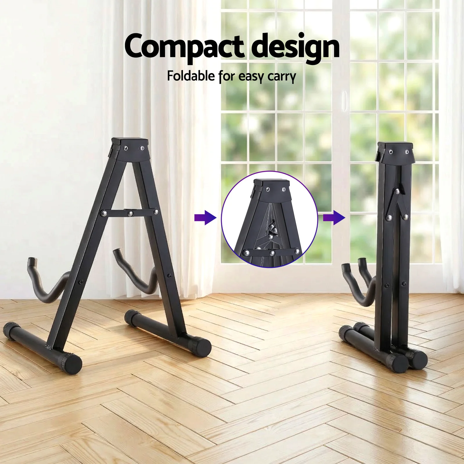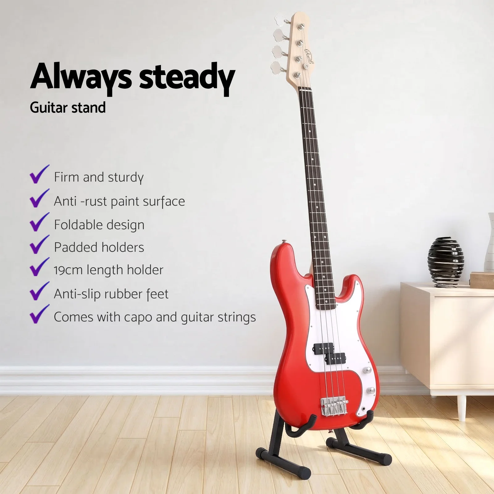 Unleash your inner rockstar with this all-in-one Alpha guitar package, perfect for beginners and experienced musicians to get started right away. The centerpiece is a striking, glossy red electric guitar featuring a comfortable basswood body and a sturdy maple neck; its open-coil humbuckers and 21 frets create a rich and powerful sound. The set includes all the essentials like a gig bag, strap, picks, and spare strings, allowing you to play right out of the box. Shape your perfect tone with the durable and portable 40W practice amplifier, equipped with a solid case, protective corners, and intuitive bass, middle, and treble control knobs. For moments when you're not playing, the ultra-sturdy, powder-coated steel guitar stand provides safe support for your beloved instrument. Its padded triangular design and anti-slip feet ensure excellent stability, while the foldable frame makes it easy to store or carry to any gig—plus, it comes with a bonus capo and a set of strings as an extra surprise.