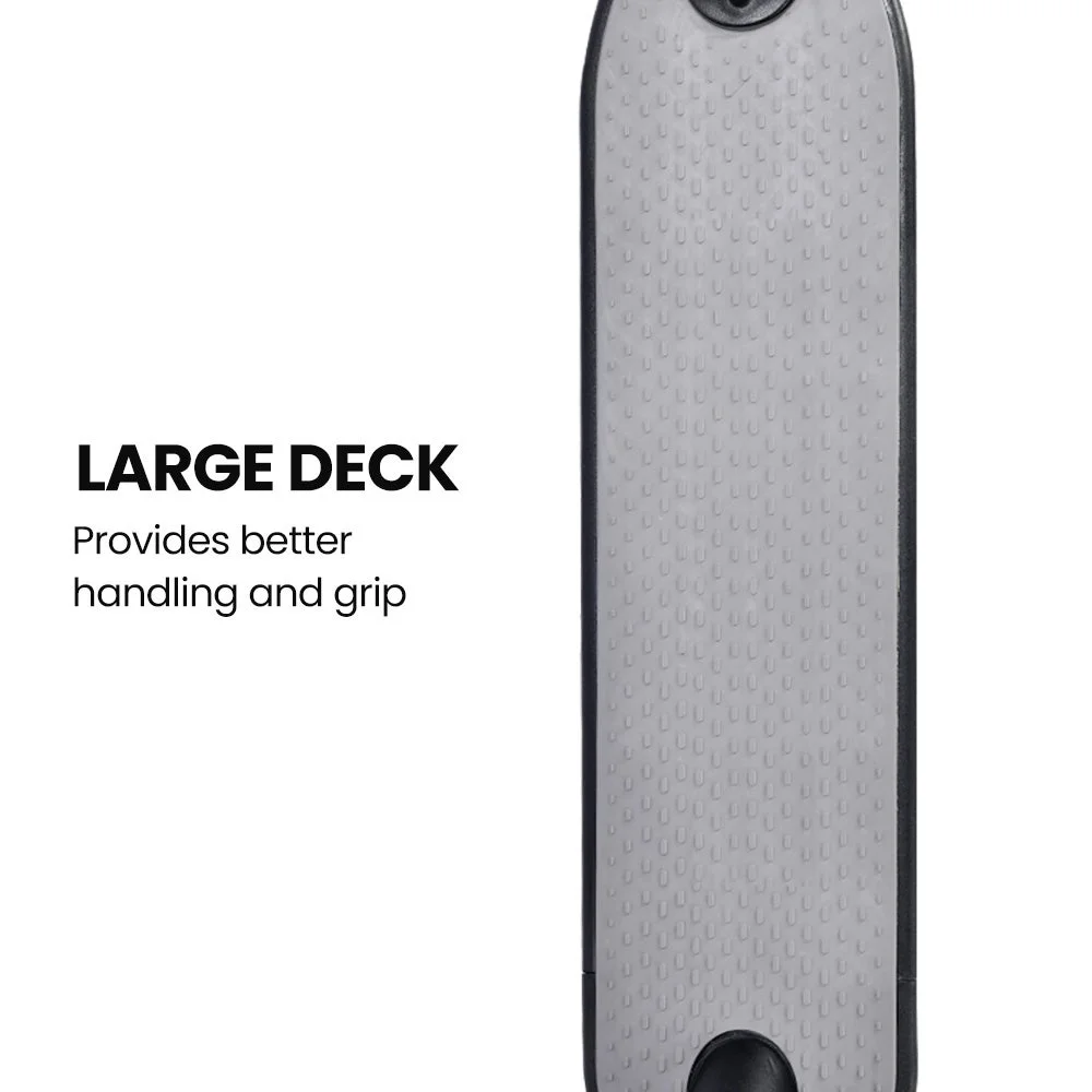The scooter's design is ideal for adults and teens alike, featuring a long deck for enhanced control. The 8.5-inch airless tyres work with the rear torsion plate to absorb shock and dampen vibration.
