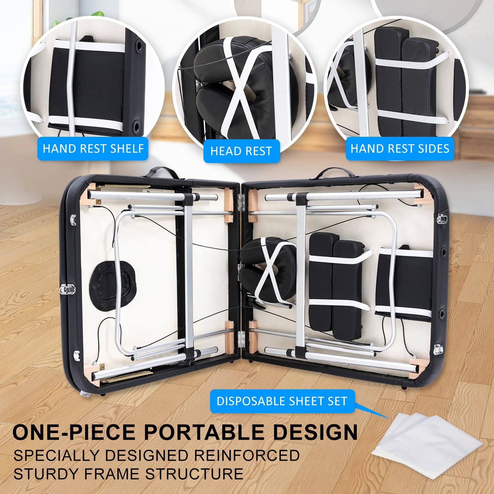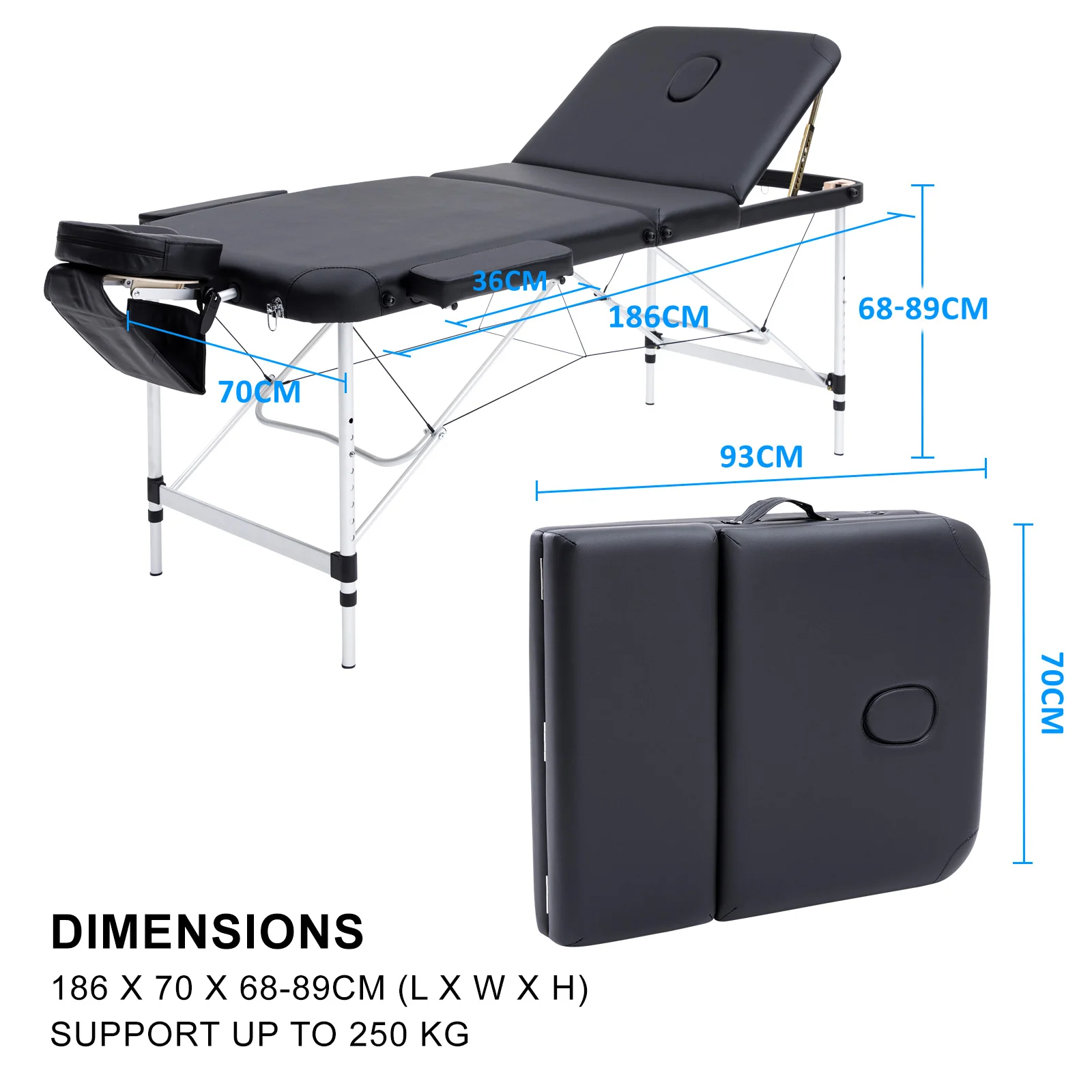 The high-quality massage table 70cm wide 3-fold aluminium comes with a disposable sheet cover set and a black carry bag. This is not only a mere great bargain, but also a portable product with all means of functional components.