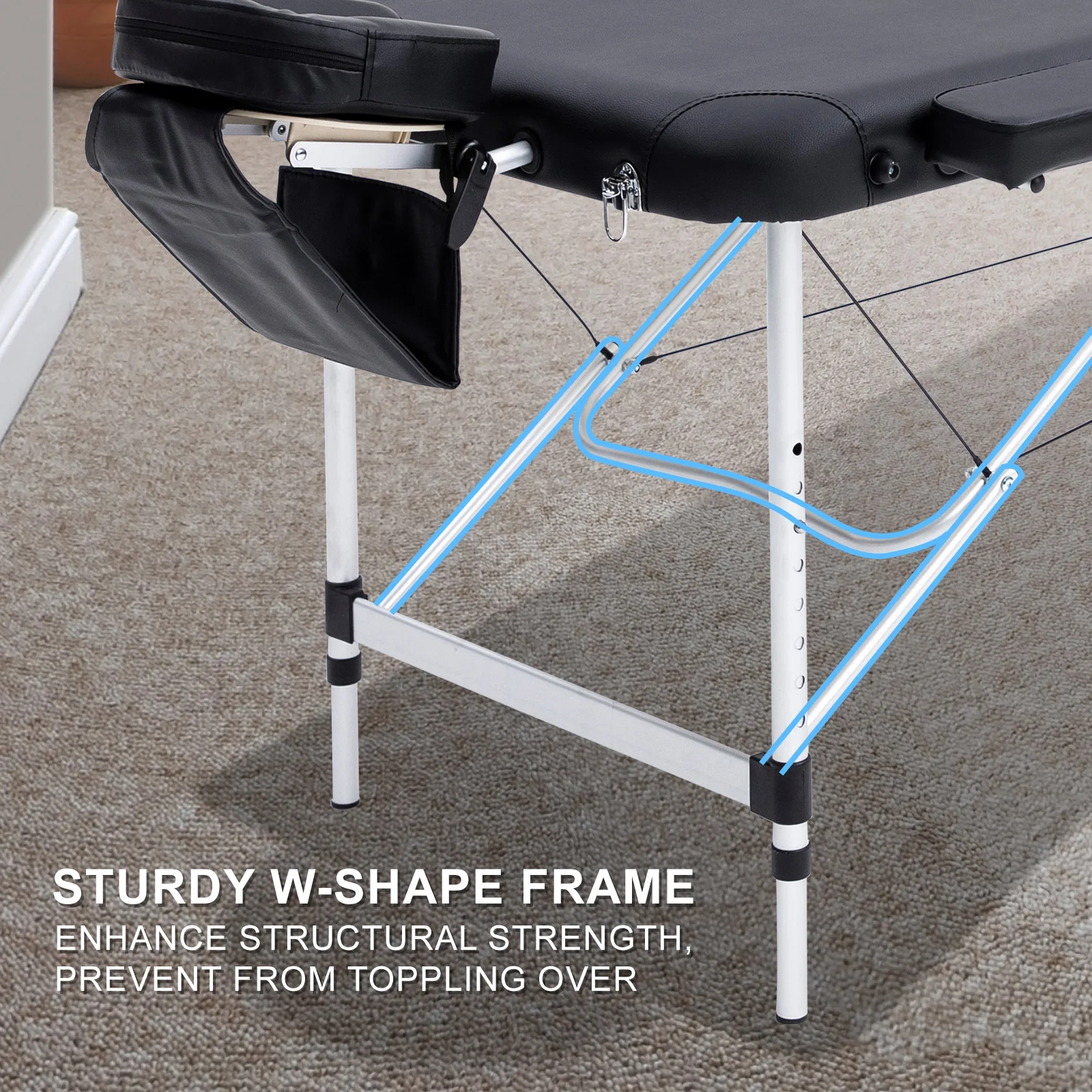 With an aluminium-made structure, it ensures that the table is light-weighted, allowing users to carry it to different places. However, this doesn't sacrifice its safety as it is equipped and reinforced with a w-shaped pole that goes across both legs. It helps increase the stability of the table, preventing it from toppling over. Furthermore, this latest design is harnessed with a Quick-Lock system, reducing hassles in opening and folding up the table. The legs are also equipped with 8 adjustable heights, to suit masseuses and beauty therapists of different heights, making sure they are working comfortably and providing their best service.