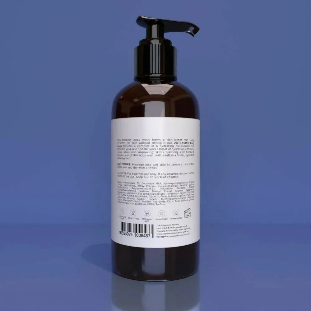 This foaming body wash forms a rich lather that easily cleanses the skin without drying it out. ANTI-AGING body wash features a complex of 6 hydrating moisturisers that cleanses your skin and delivers a boost of hydration with every wash while also improving skin's elasticity and firmness. Regular use of this body wash will result in firmer, hydrated, glowing skin.