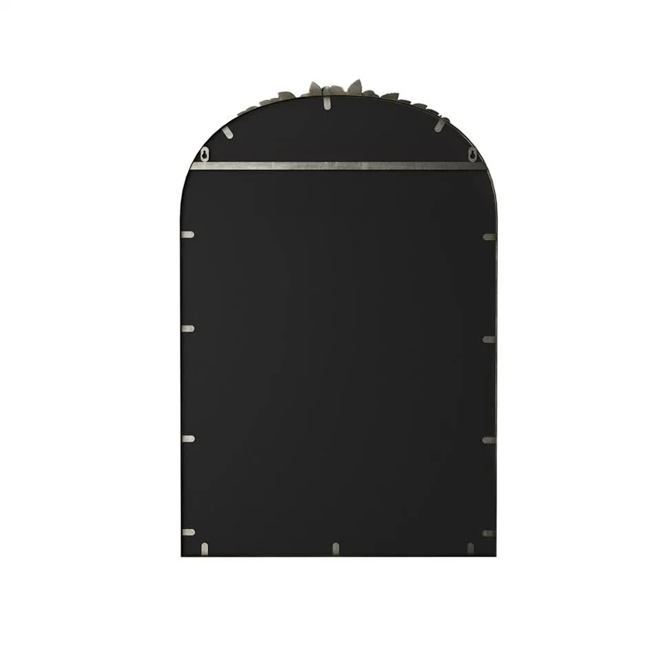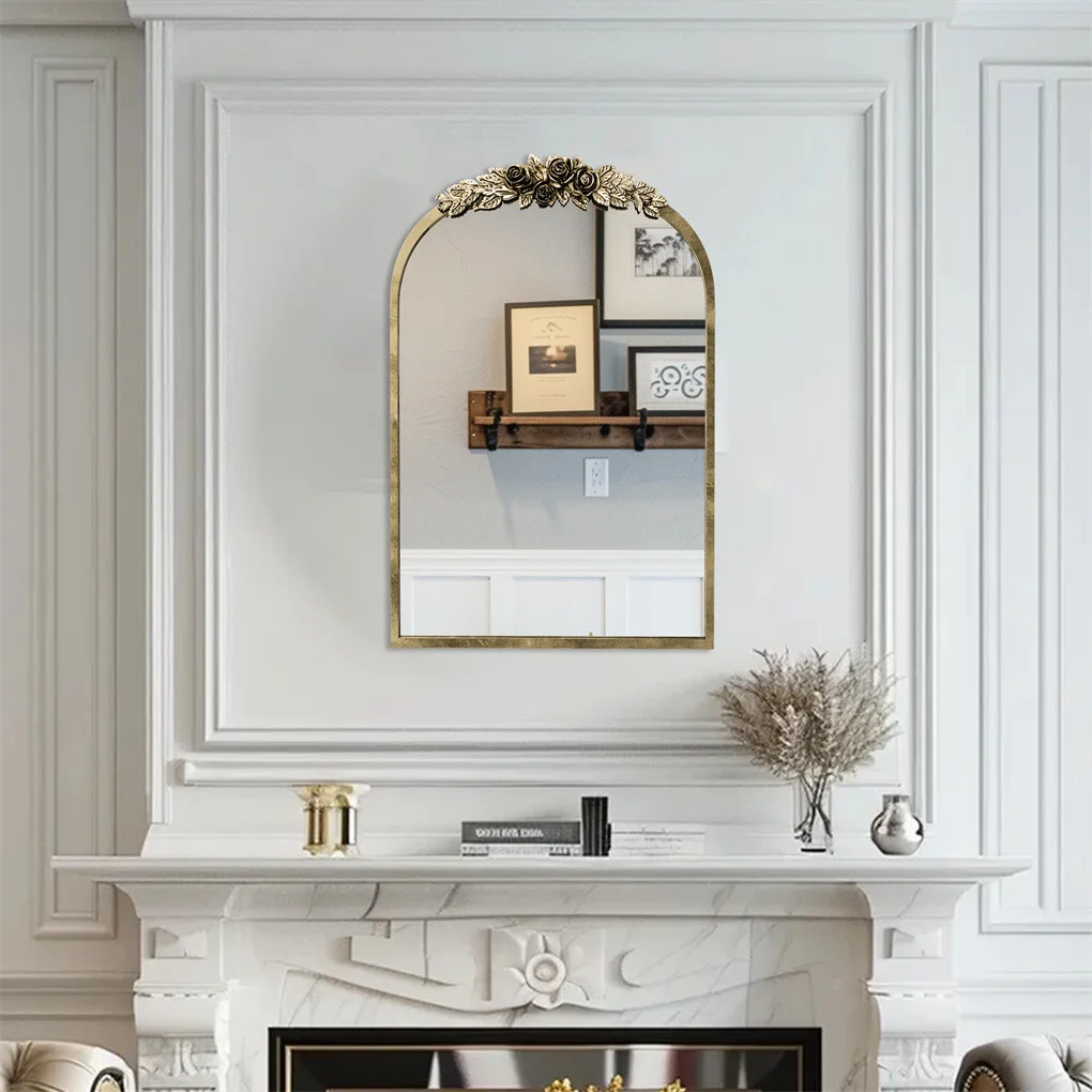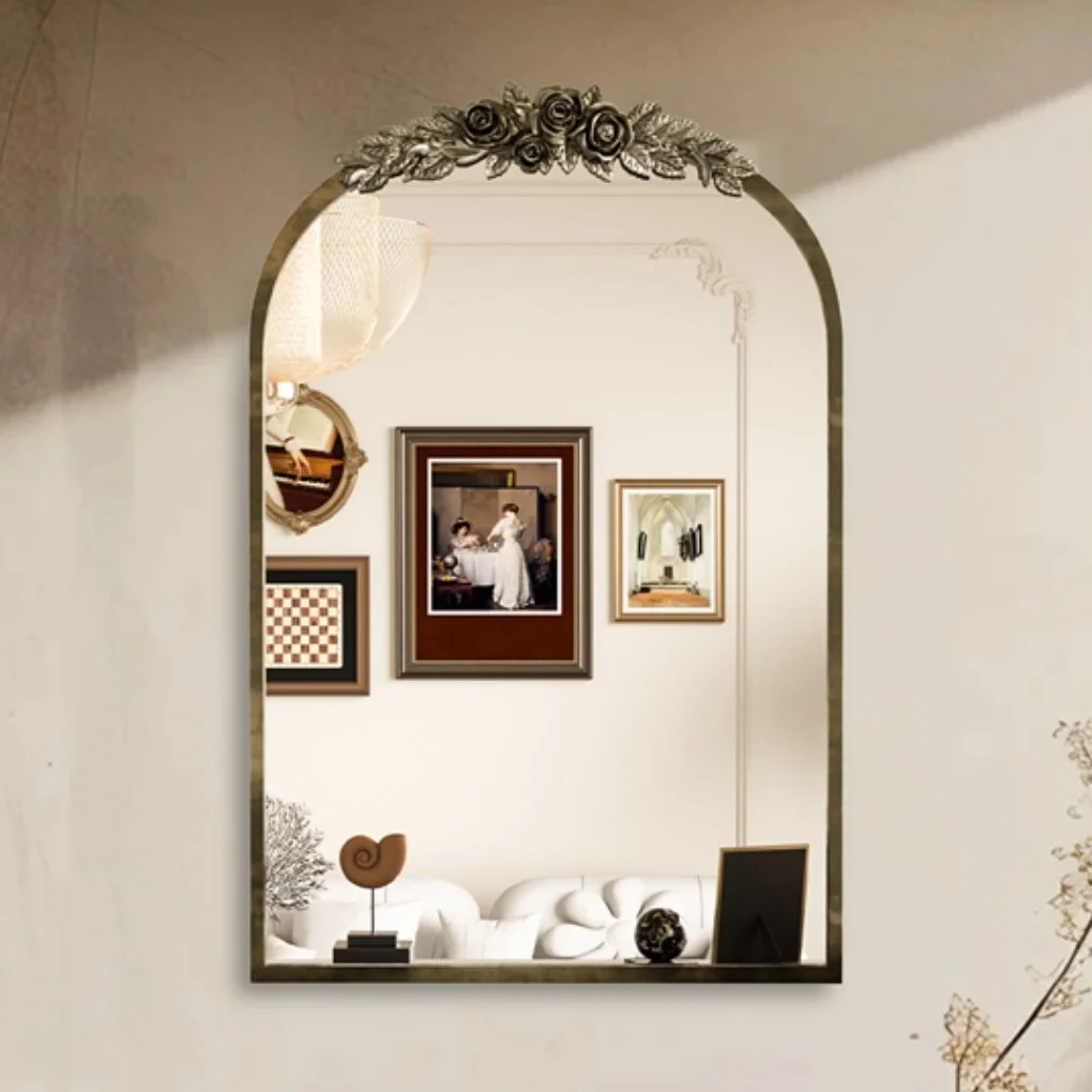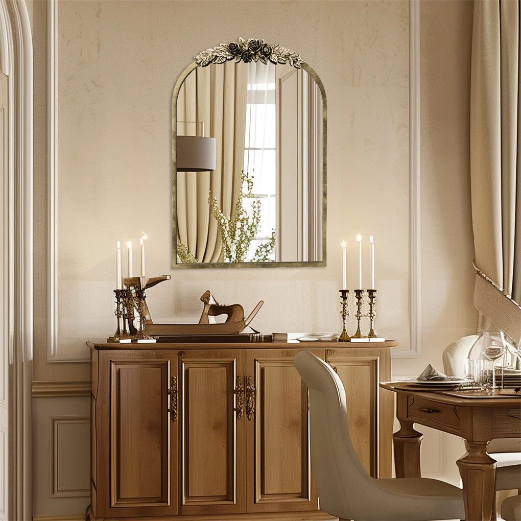 - Antique brass wall mirror with delicate rose molding, adds interest and artistry.