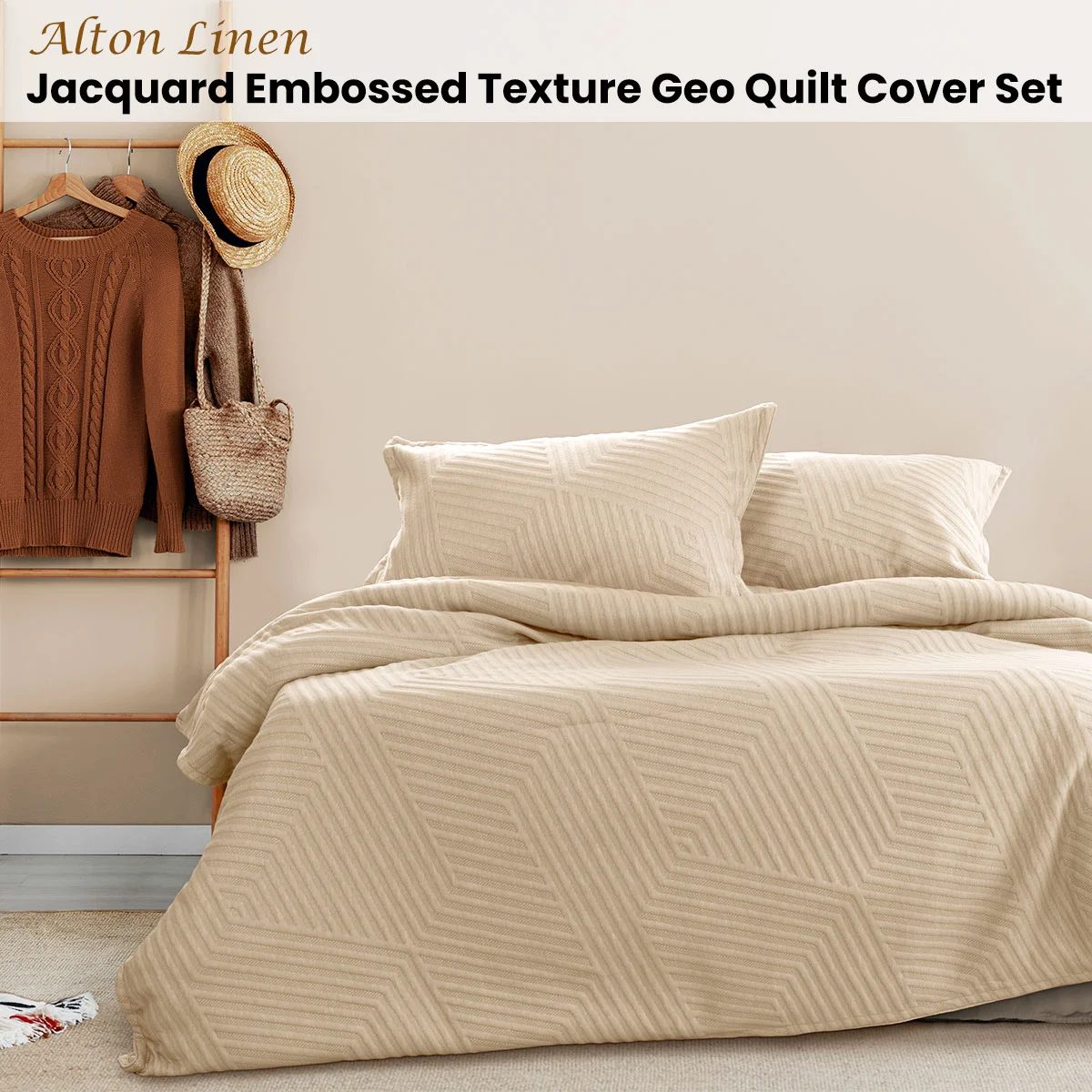 The Alton Linen Jacquard Embossed Texture Geo Quilt Cover Set by Ardor features a beautiful flowing geo jacquard front paired with a plain dyed reverse. Alton brings a modern style of earthy understated textures to your bedroom decor. It is made from quality and soft touch polyester fabric that can add extra layer of warmth and comfort to your home space.