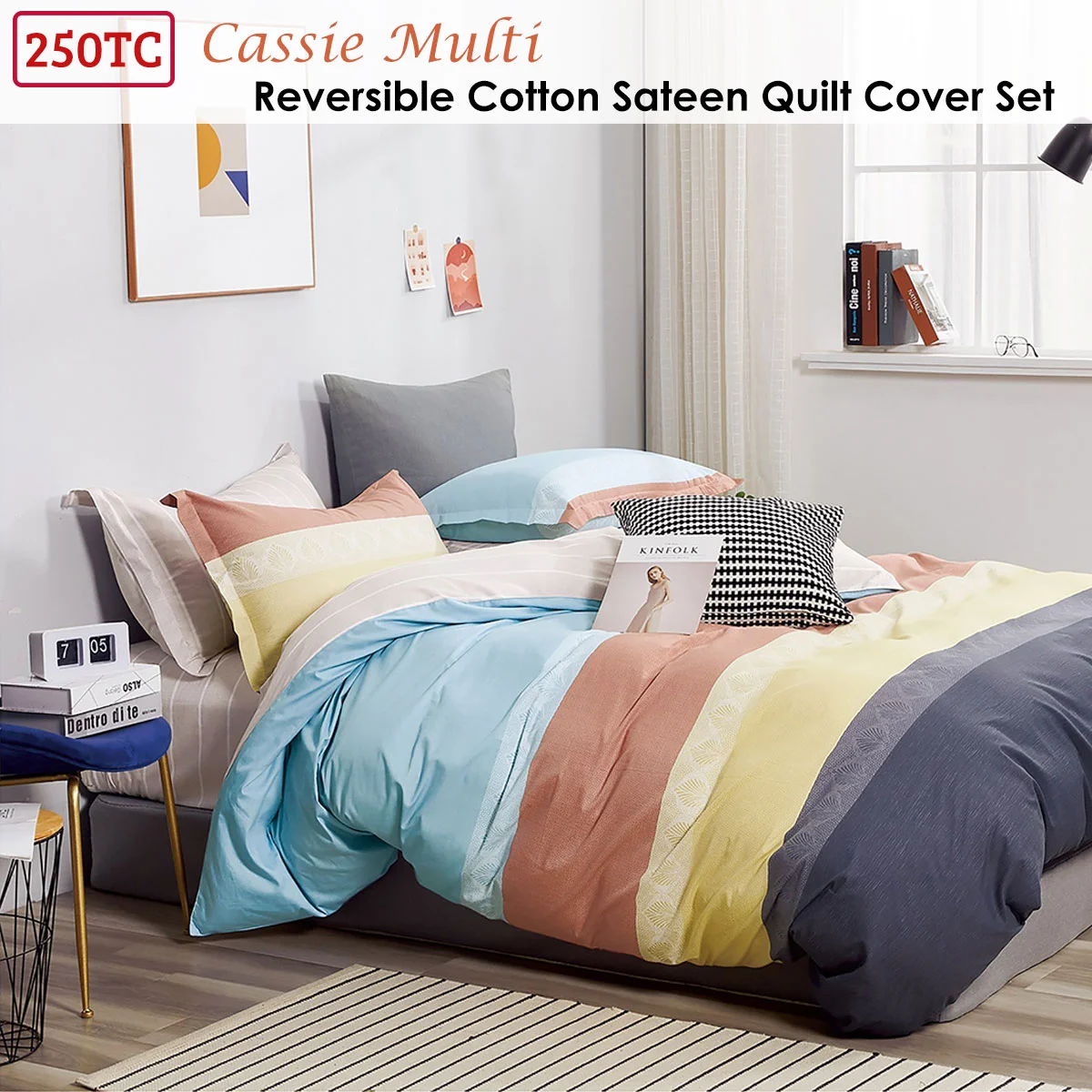This 250TC Cassie Cotton Sateen Reversible Printed Quilt Cover Set by Ardor is our new summer stripe. The block striped design pairs fresh bursts of mauve, cream, taupe, aubergine, pink, sky, blue, white, and burgundy colour tones to brighten up your summer bedroom. It is made from soft touch and easy care 100% Cotton fabric.