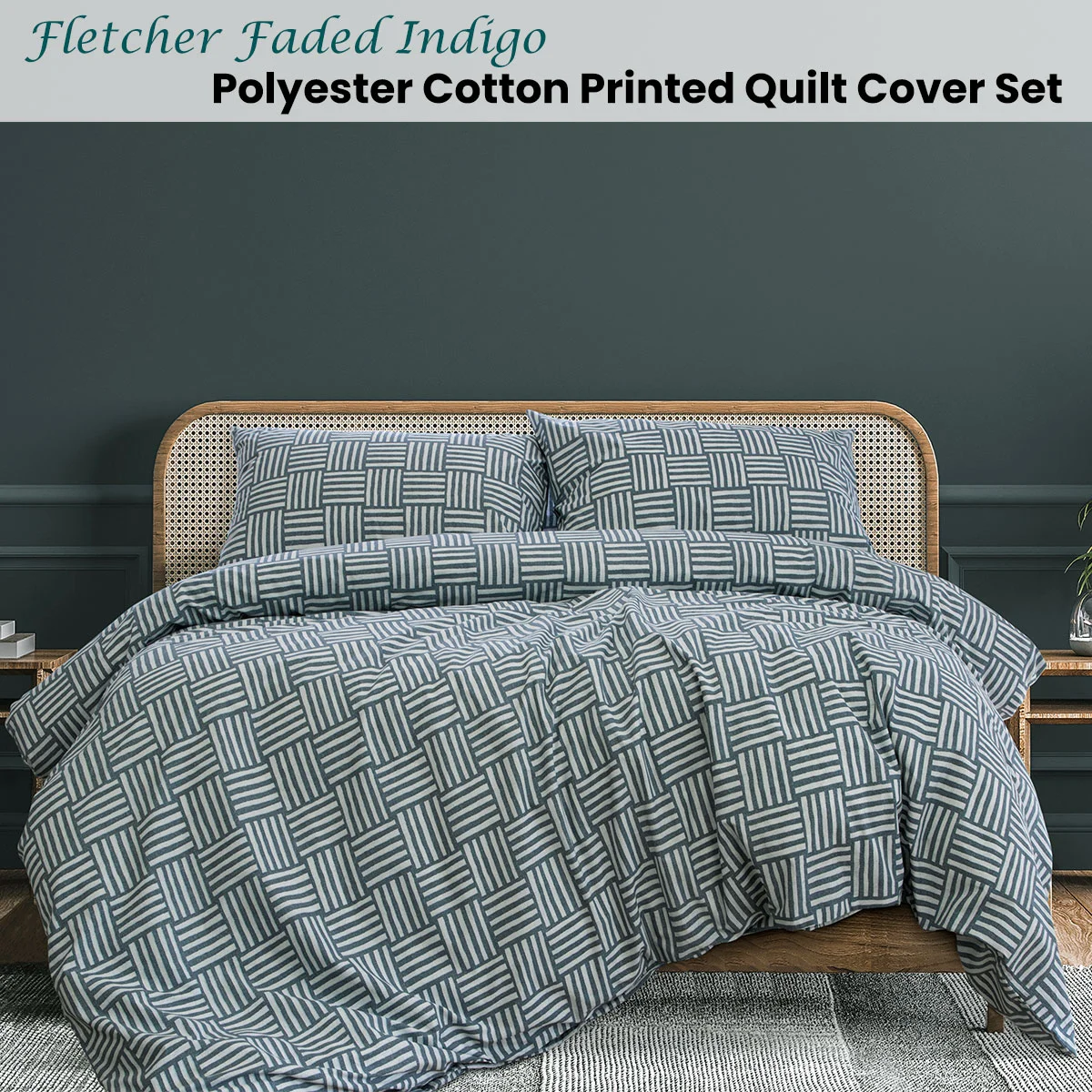 Ardor Boudoir introduces Fletcher Faded Indigo Printed Quilt Cover Set by Ardor in a tonal faded off white, blue, and indigo. Fletcher displays an organic thatched geo pattern adding soft masculine touch to your bedroom style. It is made from quality and soft touch polyester cotton fabric with easy care properties.