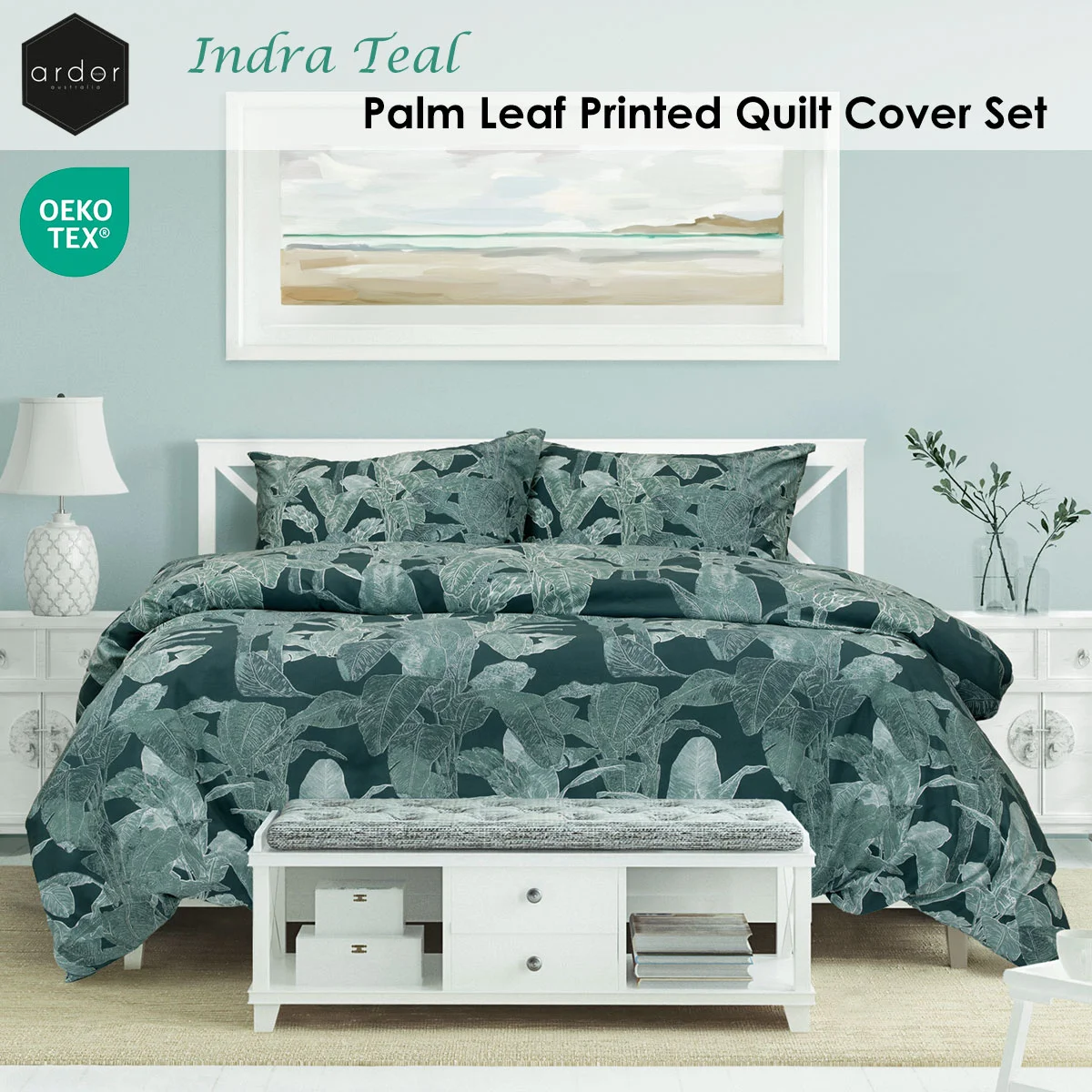 Inspired by lush palm trees swaying in the breeze, this Ardor Indra Teal Palm Leaf Printed Quilt Cover Set features a detailed palm design in teal, sage, and white hues that brings a touch of exotic elegance to your bedroom. Crafted with meticulous attention to detail, each palm leaf will transport you to a summer vacation. Made from quality polyester fabric for long lasting use.