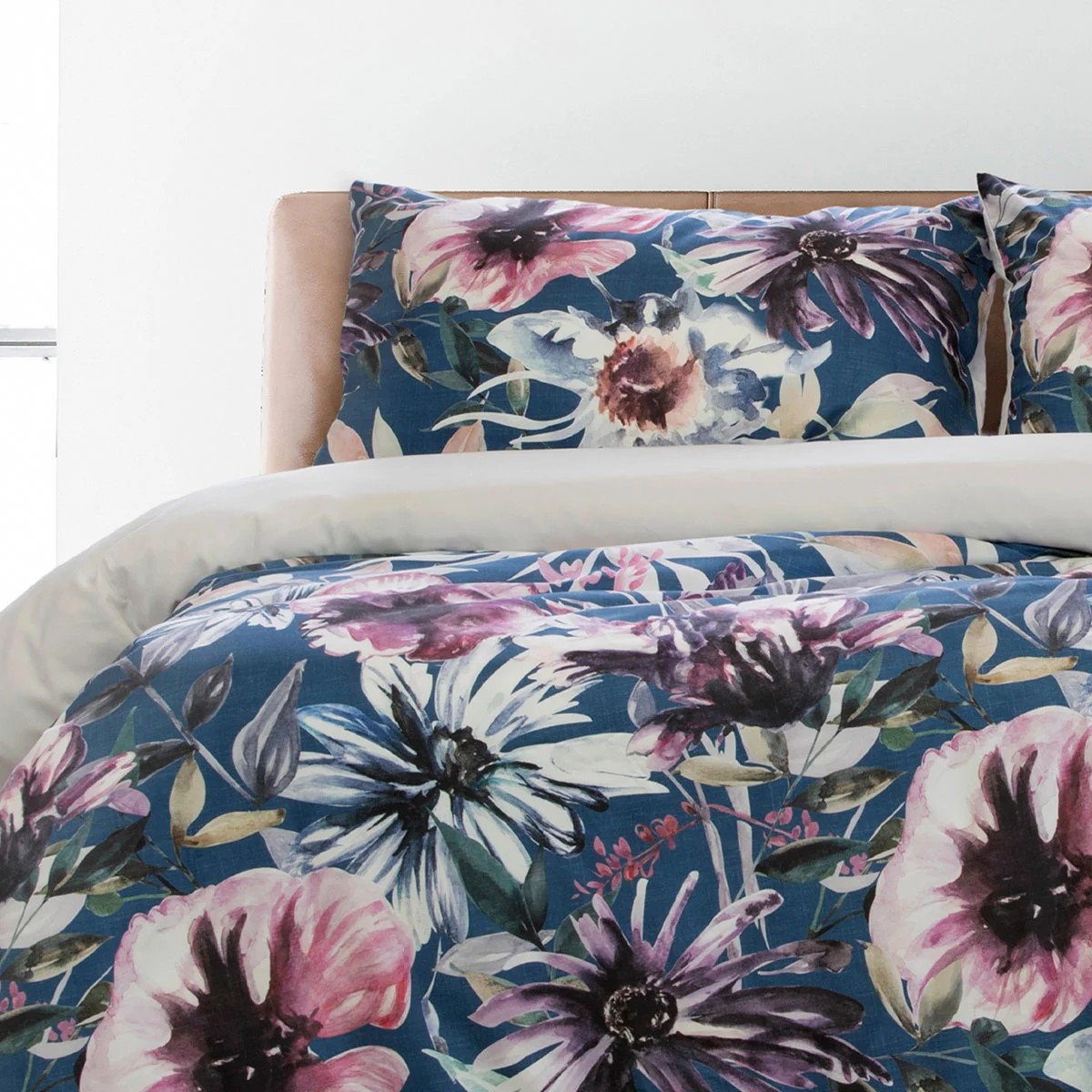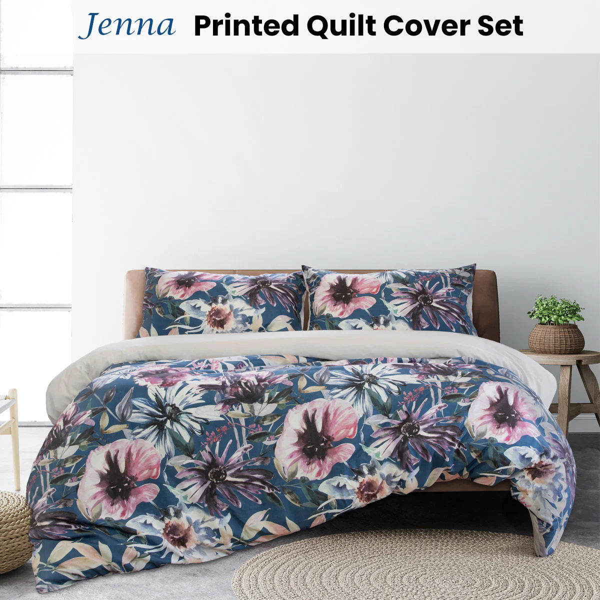 The Jenna Printed Quilt Cover Set by Ardor brings a striking bedroom story with its white, mauve, blue, navy, green, pink, purple, and black colours in this painted floral front with a plain dyed reverse quilt cover set. It is made from quality and soft touch Polyester with easy care properties.