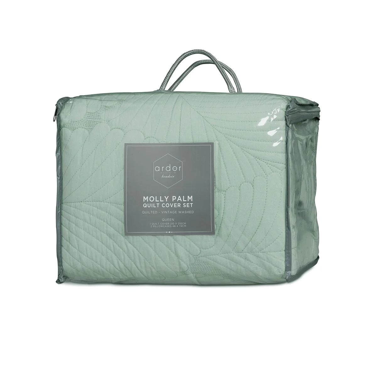 The Molly Palm Green Quilted Quilt Cover Set by Ardor is tropically tranquil with its quilted front in soothing green. The perfect way to add tropical calm to your bedroom style. It is made from quality and soft touch microfibre fabric for a relaxing and cosy night's sleep.