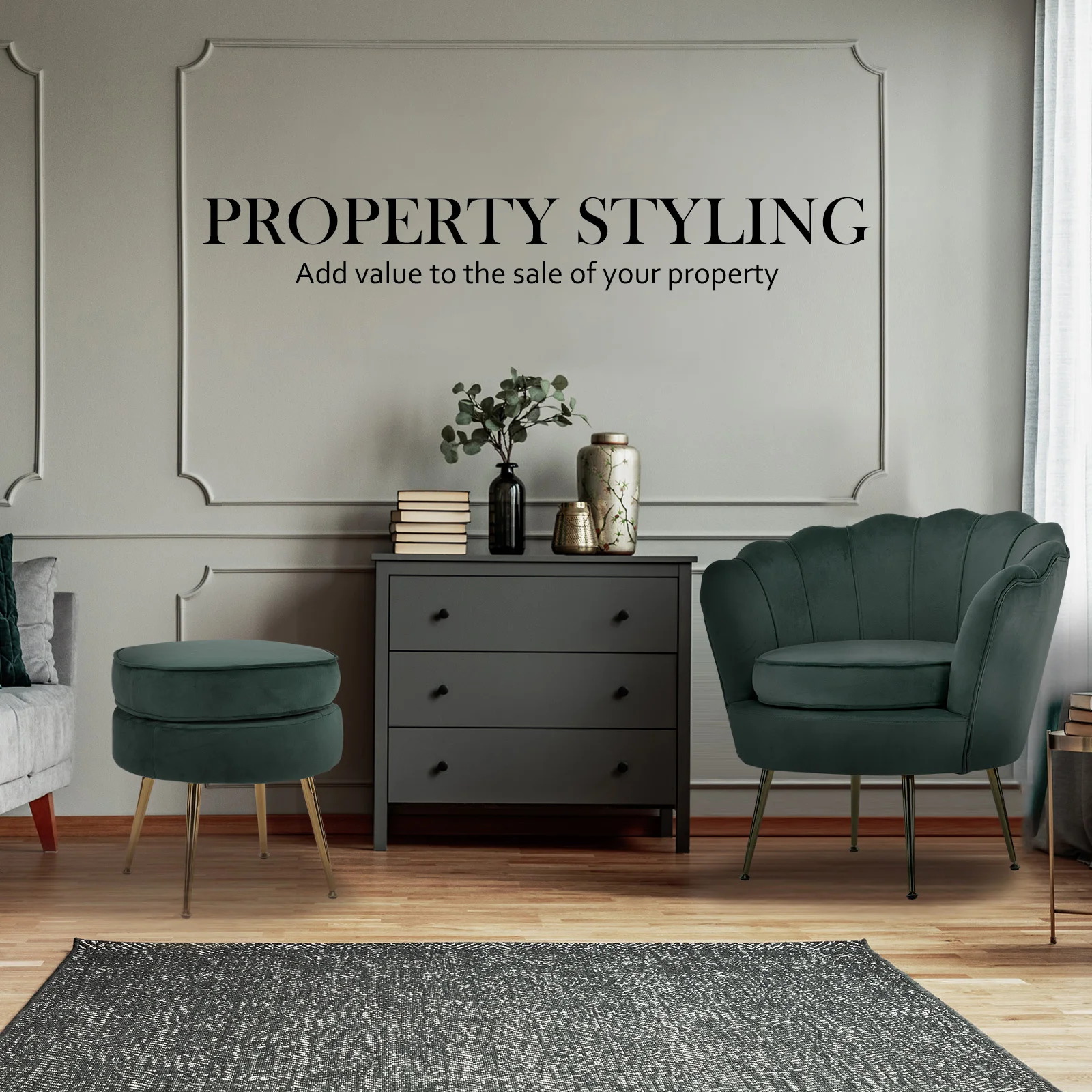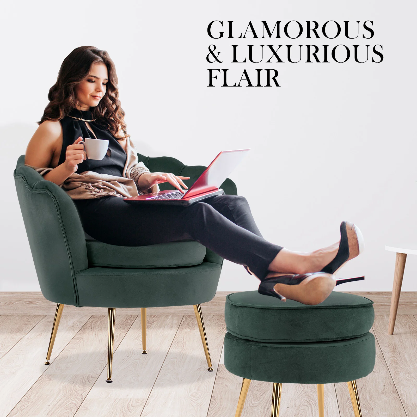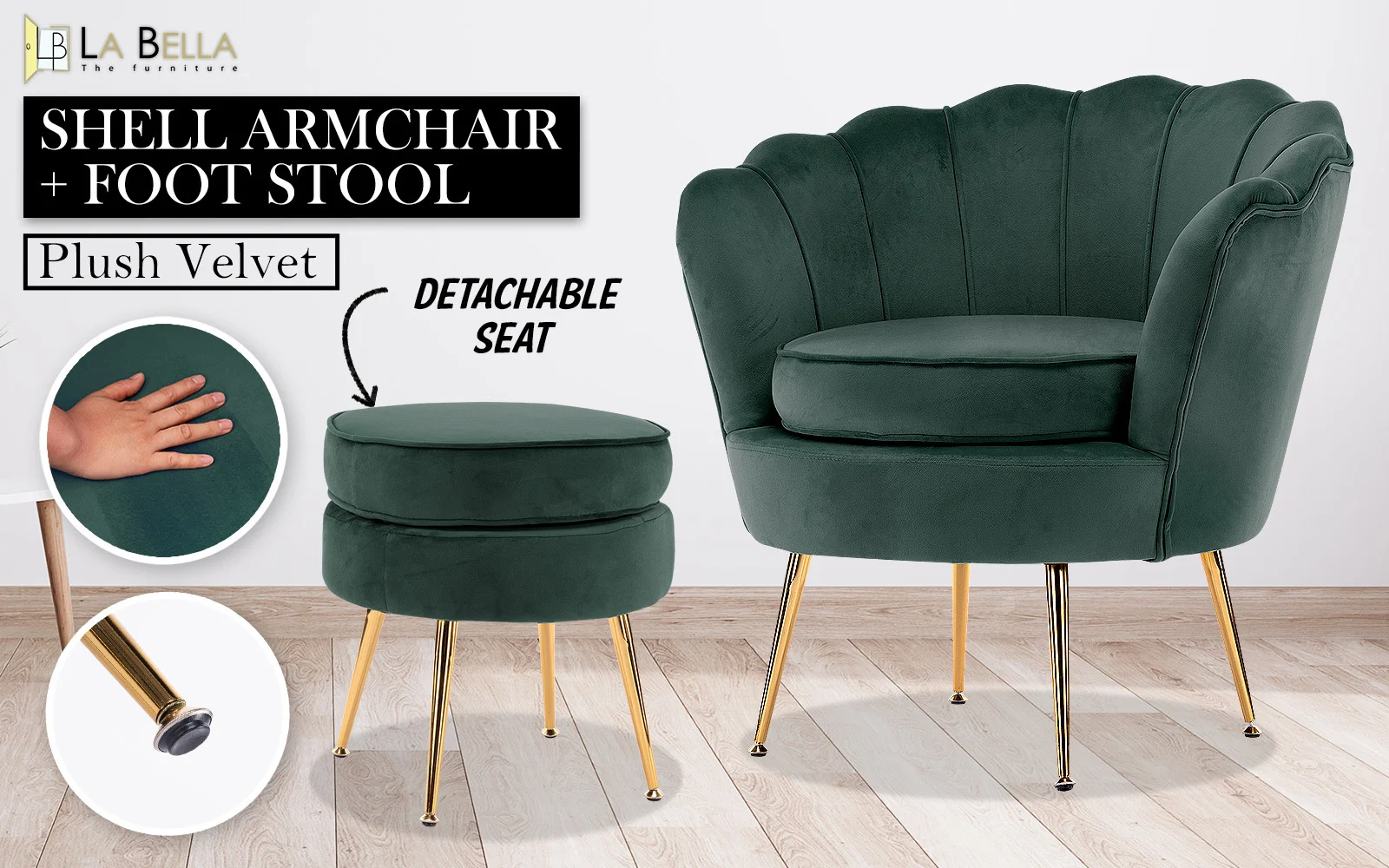 La Bella Armchair Chair Accent Velvet Shell Scallop + Ottoman Footstool Round - Green