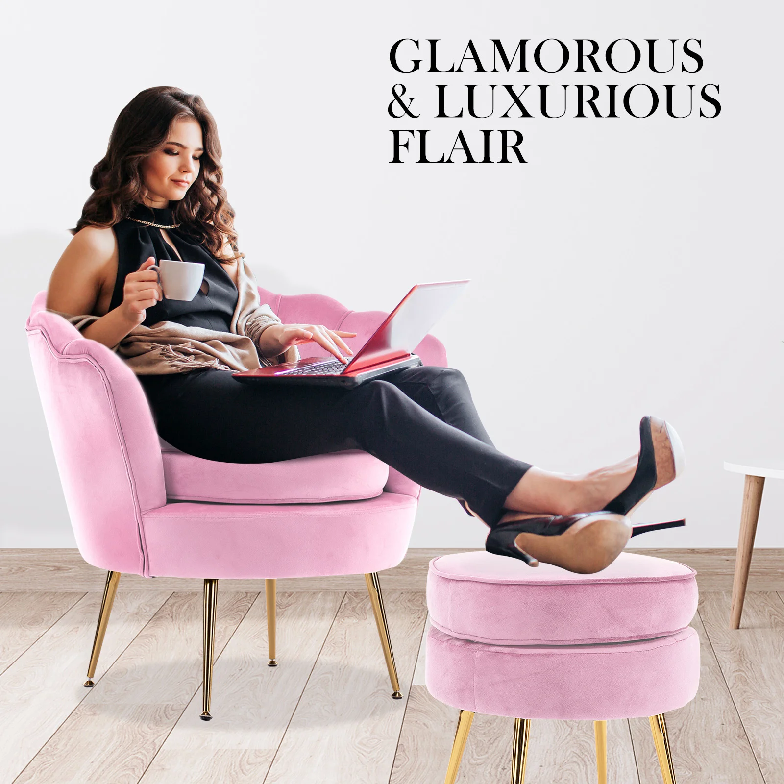 La Bella Armchair Chair Accent Velvet Shell Scallop + Ottoman Footstool Round - Pink
