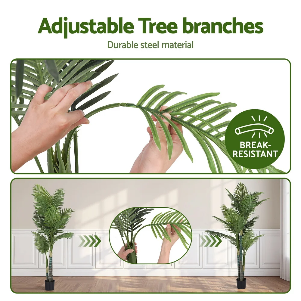 Instantly transform your space into a calming, tropical sanctuary with this lifelike artificial palm tree. Expertly crafted with stunning attention to detail, its lush foliage and realistic trunk mimic the natural beauty of an exotic palm. Enjoy the vibrant look of an indoor/outdoor feature with zero maintenance. The leaves feature a UV-resistant coating, ensuring the rich colour remains fade-free under the harsh Australian sun. Forget watering or trimming—this piece is built for effortless living. Designed for stability, the tree uses durable, non-toxic materials and comes pre-potted in a stable, weighted pot base. Simply wipe the foliage clean to maintain its pristine, year-round elegance.
