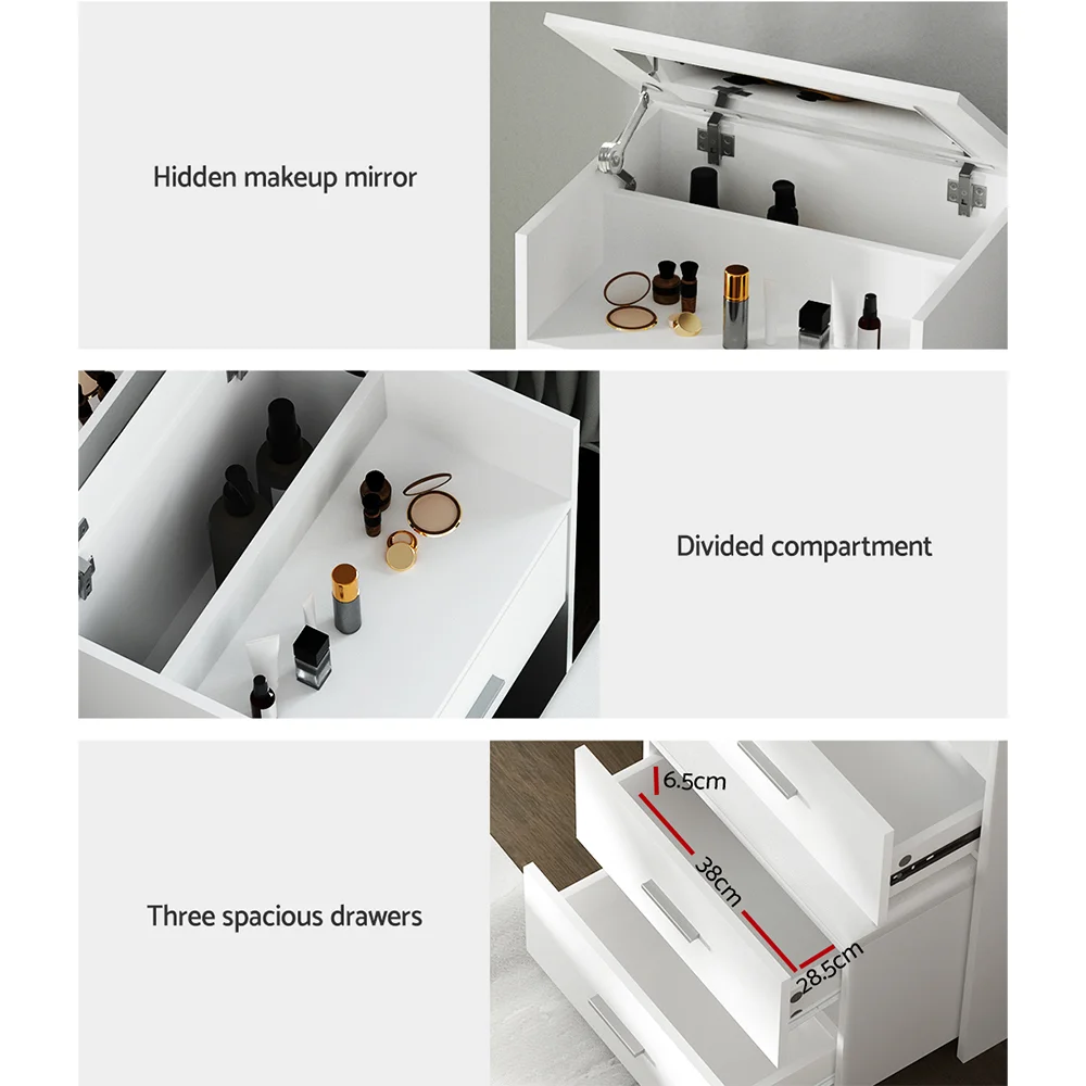 With a combination of unique structural design, chic aesthetic, and maximum style, the Artiss 2-in-1 bedside dressing table is sure to make a statement with a clean aesthetic and contemporary style that will blend with your existing decor. It comes with a hidden mirror and a soft padded stool with rotatable wheels, flaunting a clever and timeless design that caters to the bedroom of all sizes. This minimalist style furniture boasts a practical design that allows ease of use and convenience. The smooth-sliding three spacious drawers and a divided storage compartment enable you to store your belongings neatly and elegantly. It makes a perfect storage solution, where you can also put your most-loved collection of jewellery for display. A high-gloss finish on the front offers an attractive sheen for a fresh, clean look. And with particle board construction, your bedside dressing table will withstand the test of time. Not least, its sleek handles exude a contemporary vibe that stands out from the mundane. Purchase this ultimate bedroom essential today.