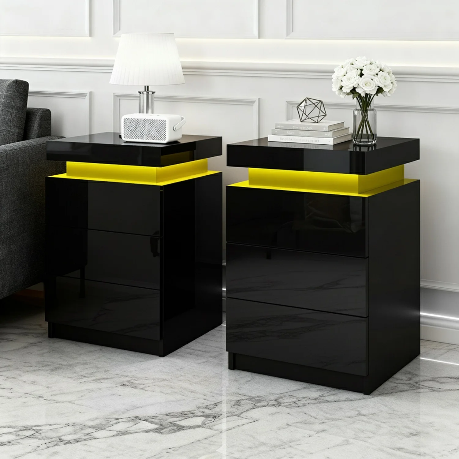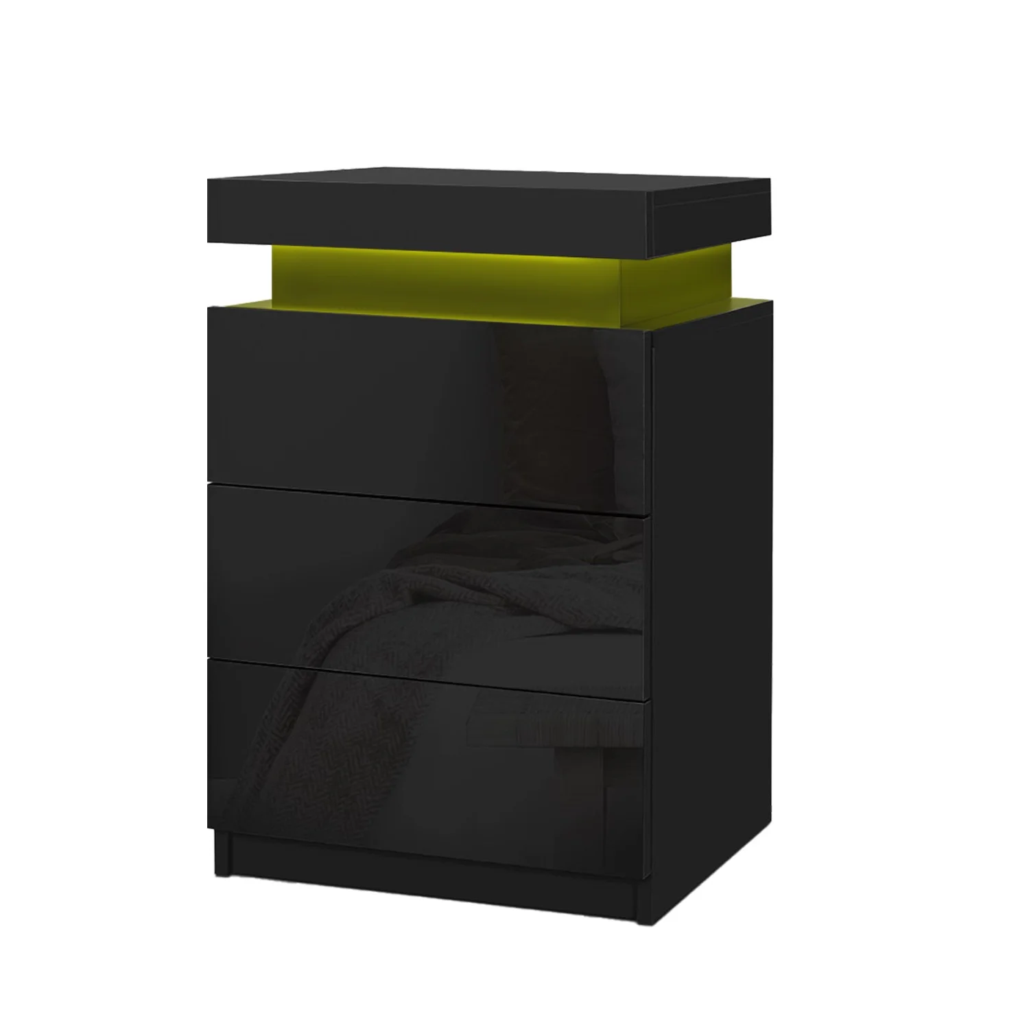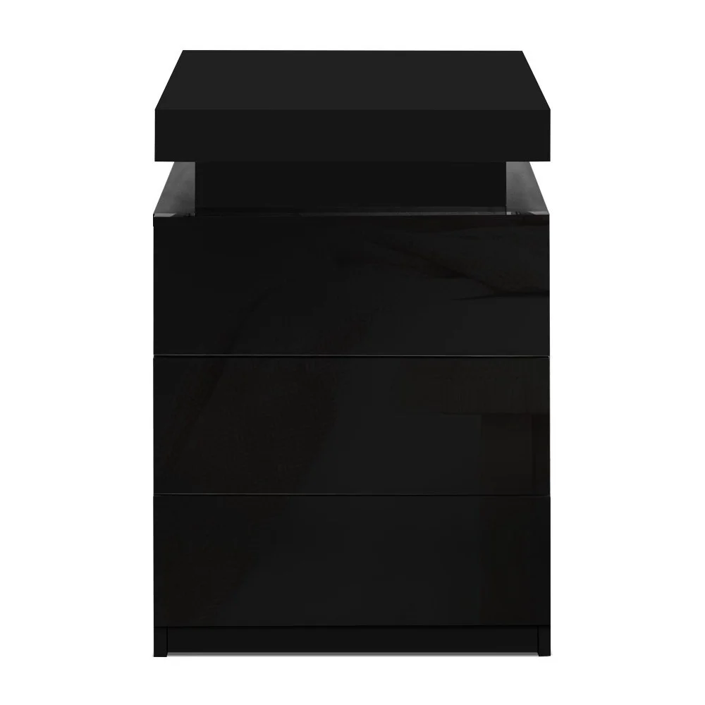 Tired of fumbling in the dark for a light switch in the middle of the night? With our Artiss LED Bedside Table, your problems are solved. The bedside table comes with built-in LED lighting that can be customised into 16 different colours to suit your preference. Not only will it create a beautiful ambience, it will also save you from buying extra bedside lamps or nightlights. Three deep drawers sliding on smooth anti-rust runners provide ample storage space. There is also a top storage compartment that opens with a lift-up lid like a treasure trunk, which you can fittingly fill with your own personal treasures. Better still, the handle-free design gives it a modern vibe that stands out from the mundane. Constructed from quality particle board and MDF with melamine finish and high-gloss UV front, the bedside table is durable and easy to maintain. And it will be the perfect addition to your modern bedroom with its contemporary and linear design. Or you can keep one in the living room to wow all your houseguests.