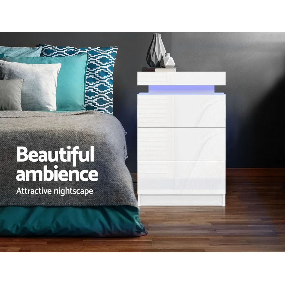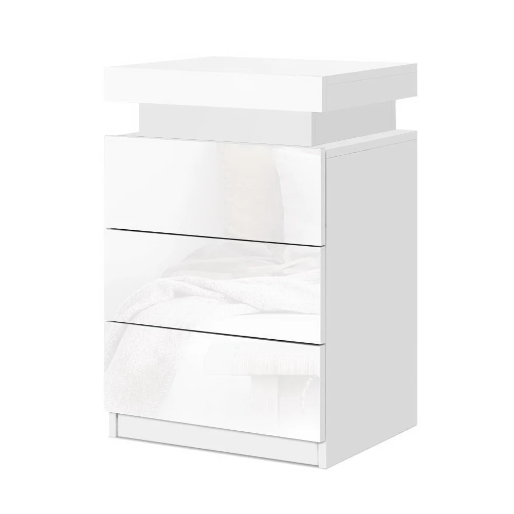Tired of fumbling in the dark for a light switch in the middle of the night? With our Artiss LED Bedside Table, your problems are solved. The bedside table comes with built-in LED lighting that can be customised into 16 different colours to suit your preference. Not only will it create a beautiful ambience, it will also save you from buying extra bedside lamps or nightlights. Three deep drawers sliding on smooth anti-rust runners provide ample storage space. There is also a top storage compartment that opens with a lift-up lid like a treasure trunk, which you can fittingly fill with your own personal treasures. Better still, the handle-free design gives it a modern vibe that stands out from the mundane. Constructed from quality particle board and MDF with melamine finish and high-gloss UV front, the bedside table is durable and easy to maintain. And it will be the perfect addition to your modern bedroom with its contemporary and linear design. Or you can keep one in the living room to wow all your houseguests.