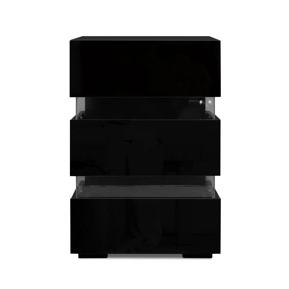 Tired of fumbling in the dark for a light switch in the middle of the night? With our Artiss LED Bedside Table, your problems are solved. The bedside table comes with built-in LED lighting that can be customised into 16 different colours and 4 different effects to suit your preference. Not only will it create a beautiful ambience, it will also save you from buying extra bedside lamps or nightlights. Three deep drawers sliding on smooth coated runners provide ample storage space. Better still, the handle-free design gives it a modern vibe that stands out from the mundane. Constructed from quality particle board and acrylic glass with smooth melamine finish and high-gloss UV front, the bedside table is durable and easy to maintain. And it will be the perfect addition to your modern bedroom with its contemporary and linear design. Or you can even keep one in the living room to wow all your houseguests.