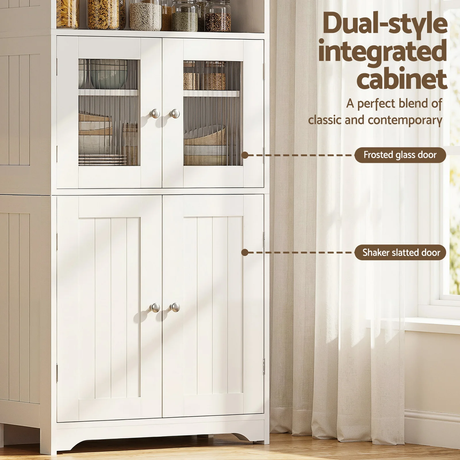 Elevate your home's organisation and style with this versatile storage pantry cabinet. Combining practicality and elegance, it features a dual-style design with frosted glass and shaker slatted doors, adding a sophisticated touch to any space. Inside, two adjustable shelves provide flexible storage, perfect for pantry essentials, cookware, or decorative items. Built from durable particle board, this pantry boasts non-mortise hinges, magnetic door catches, and exquisite metal knobs for a refined finish. Two anti-tip kits ensure safety, while the smooth surface makes cleaning a breeze. Assembly is simple, making it the ideal addition to your kitchen, dining room, or living space. Add style and practicality to your home today!
