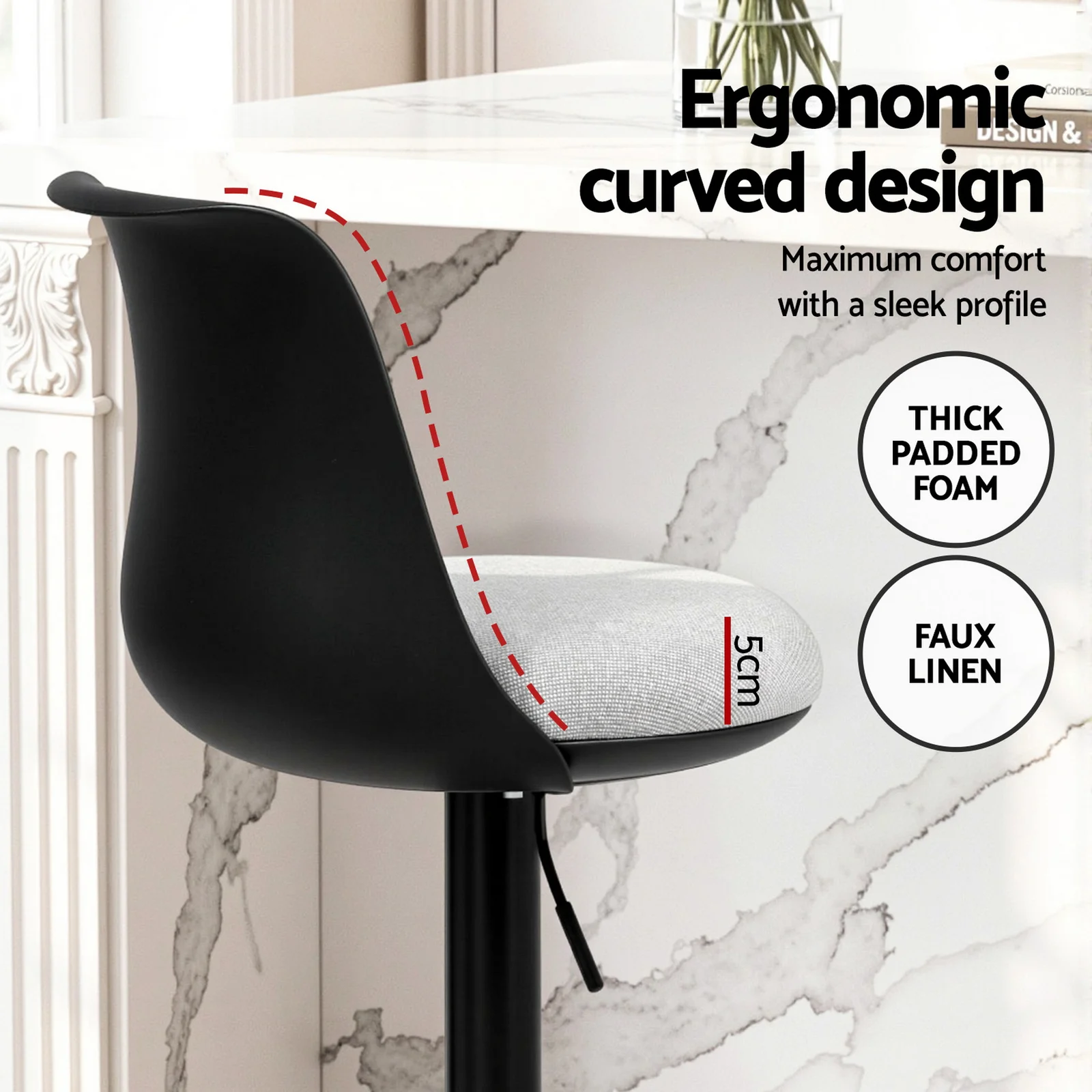 Upgrade your home with this stylish and functional set of 4 bar stools. Featuring adjustable seat height (64cm-85cm), these stools cater to various seating needs, whether for a kitchen counter or bar top. The ergonomic curved backrest and thick foam padding ensure maximum comfort, while the premium faux linen fabric adds a sophisticated touch to your decor. Built with a reinforced gas lift cylinder and sturdy metal construction, each stool supports up to 120kg. The semi-circular footrest ring enhances comfort, and anti-slip floor protectors safeguard your floors. Assembly is quick and easy, making these stools the perfect choice for any modern home.
