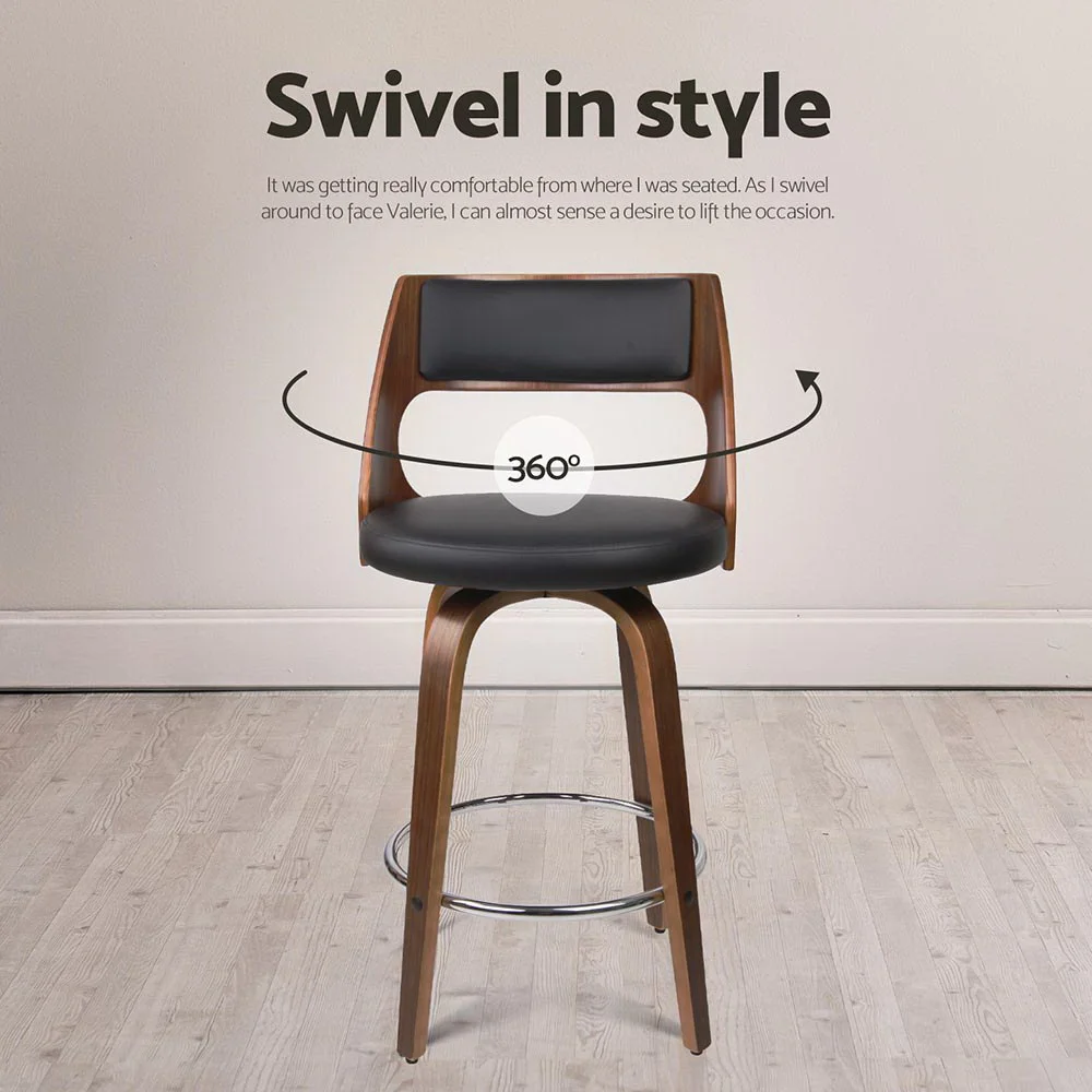 Meticulously crafted with solid wood in a stunning walnut finish for the legs, the Bentwood Bar Stool features a generous puckered faux leather integrated seat and backrest that feel comfortably smooth and look absolutely classy. The mid-height backrest also provides appreciable support while the anti-slip rubber pads at the bottom of the legs remain firm and steady even with robust use. Not least, the chrome footrest lets you perch in style, feet up.