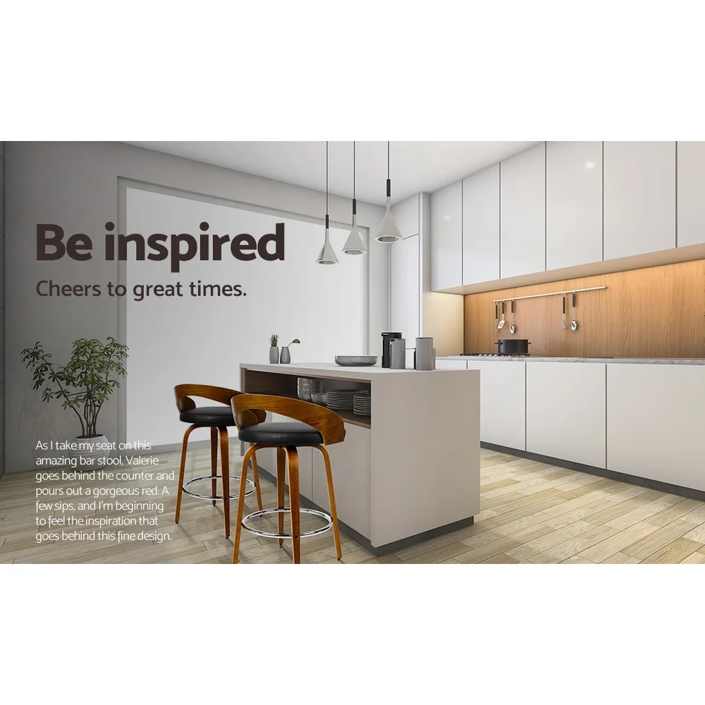 These Walnut Wood bar stools are show stoppers, and give any space an instant update. The wooden structure is complemented by a chrome leg rest and padded black seats made of PU Leather.