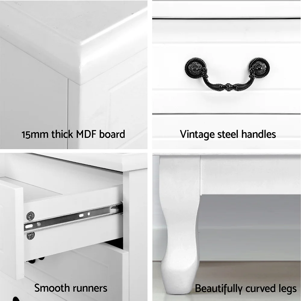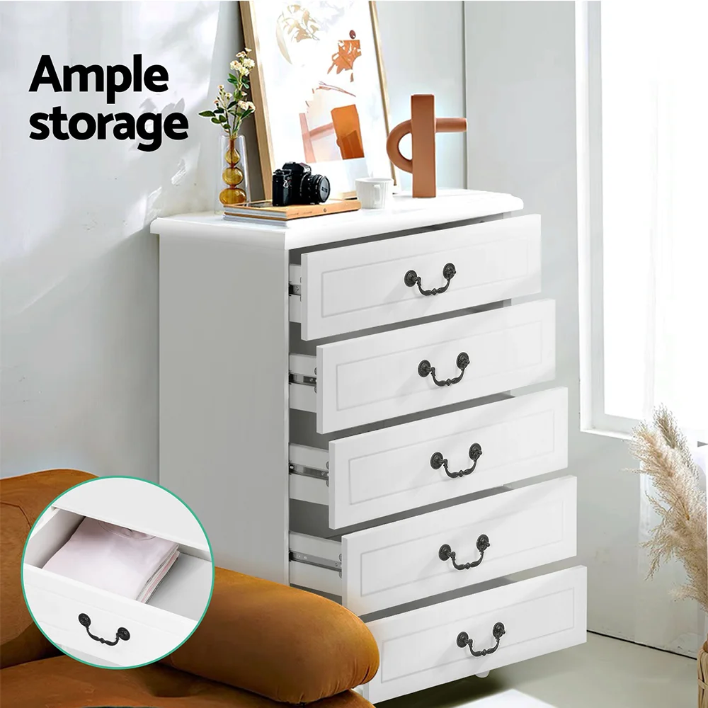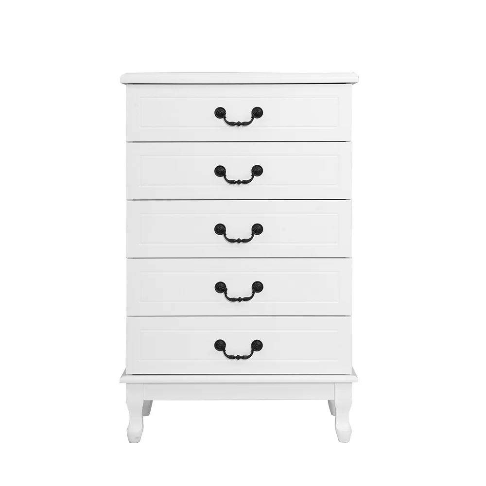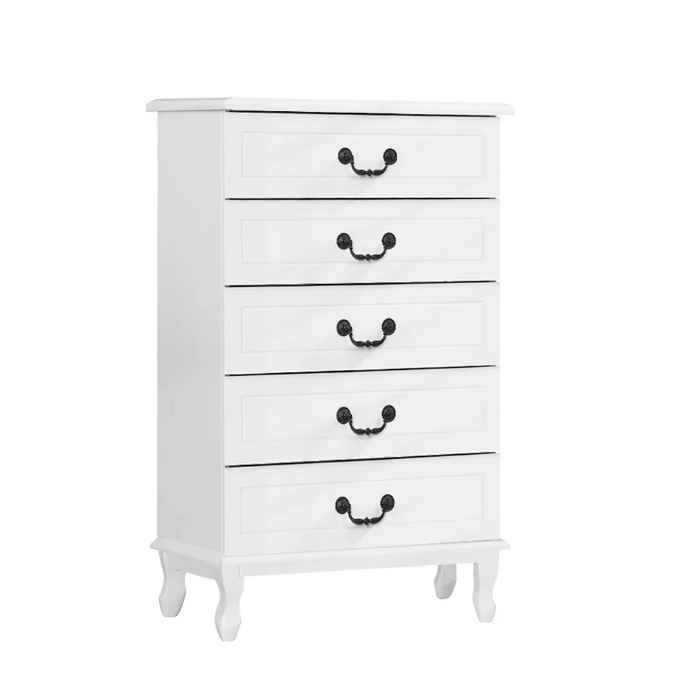 Add a touch of French provincial to your home with our charming KUBI Tallboy chest of drawers. It is not only timeless design – the unit is made to both last and pleases, with 15mm thick MDF boards, beautifully curved pinewood legs, smooth drawer runners, and vintage metal handles. Five large drawers provide plenty of storage for all your daily essentials so that everything is close at hand. The classic design means that this chest of drawers will suit any room, all year round! Better still, you can mix and match with other products from the KUBI series for a complete timeless style.