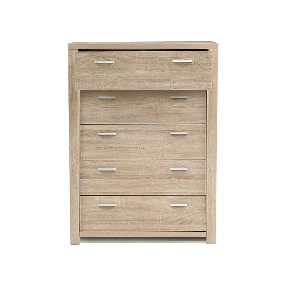If you find yourself in need of some extra storage space, look no further than our practical and handsome Artiss MAXI 5-drawer Tallboy. With its effortlessly simple and contemporary design, this beauty is crafted from 15mm thick particle board and a delightful, smooth natural woodgrain finish that will easily match your existing home d��cor. It provides plenty of storage space with five generously sized drawers for all your personal essentials. The drawers are easy to open and close thanks to the anti-rust coated metal drawer runners that always ensure smooth operation, and the elegant double handles make it convenient to access the drawers without hassle. Anti-scratch floor protectors fitted at the base of the tallboy keep your floors in pristine condition with every use. Best of all, you can also match with other products from the Maxi series for the complete simple-natural look.
