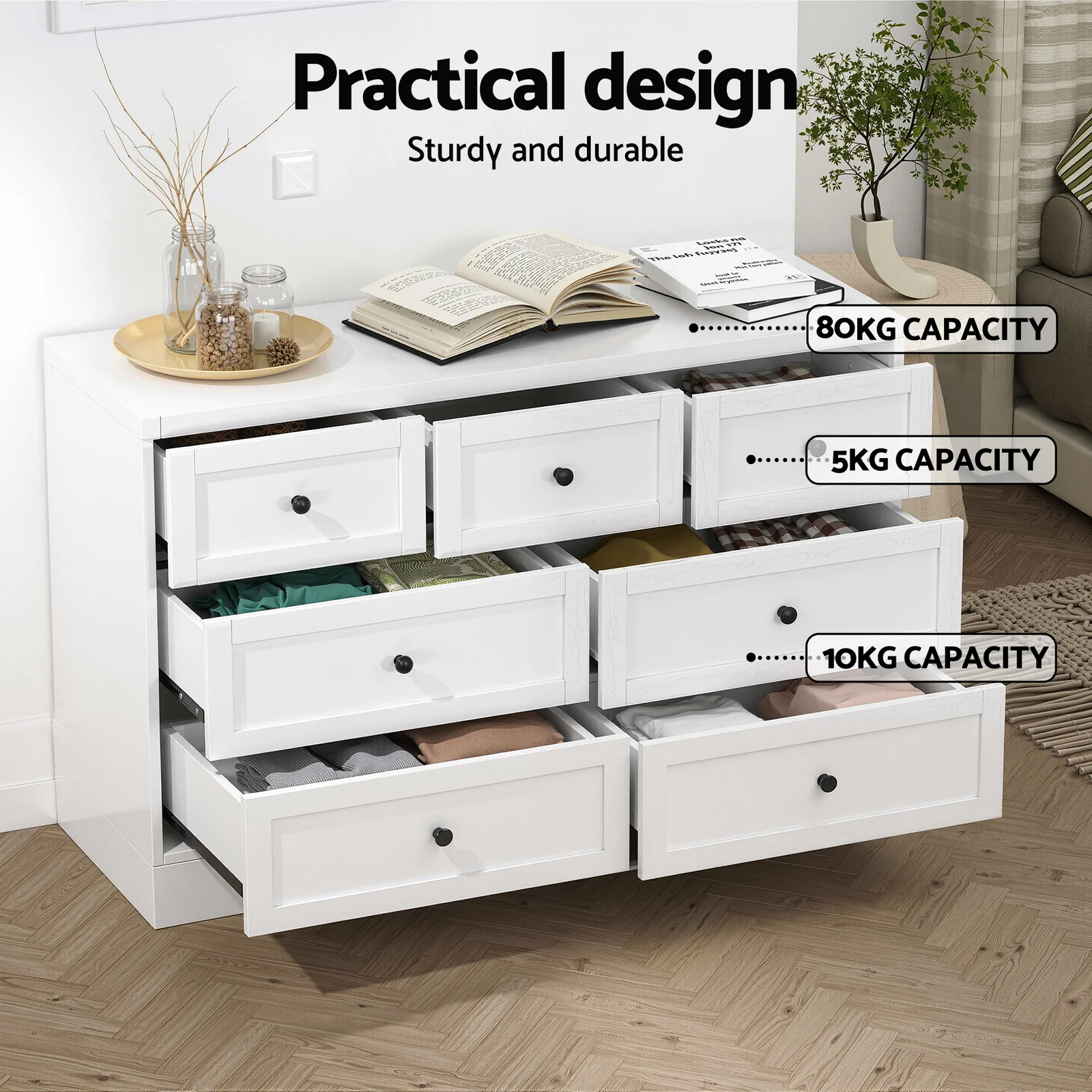 The Artiss Chest of Drawers offers a perfect blend of style and functionality, featuring 7 spacious drawers for all your storage needs. The metal handles add a modern touch, while the anti-rust coated metal drawer runners ensure smooth operation. With a high weight capacity, the top drawers can hold up to 5kg, while the bottom drawers support up to 10kg, this chest is designed to hold your items securely. It also includes a wall attachment for added stability and safety.The paper veneer finish makes the chest easy to clean and maintain. Whether for your bedroom, living room, or hallway, the Artiss Chest of Drawers is a versatile and practical addition to any space.