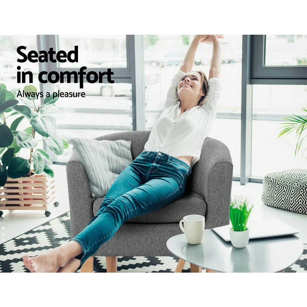 Sophistication extraordinaire. Timeless appeal. The Artiss Abby Armchair is the epitome of modernistic style with its clean lines and simple profile. Upholstered in faux linen fabric, the Abby Armchair is a full size chair with generous seating space. The extra thick foam padding ensures ultimate comfort with exceptional support while the contoured backrest feels ever so elegant and smooth. Together with a reinforced wooden frame and sturdy rubber wood legs, the Abby Armchair is guaranteed to stand up to durable use for many years to come. Not least, with its neutral grey hues, the Abby Armchair is a seamless match for any home décor. Don't settle for any armchair in your home. Make it an Artiss Abby Armchair and experience the elegant chic that it can add to your discerning lifestyle.