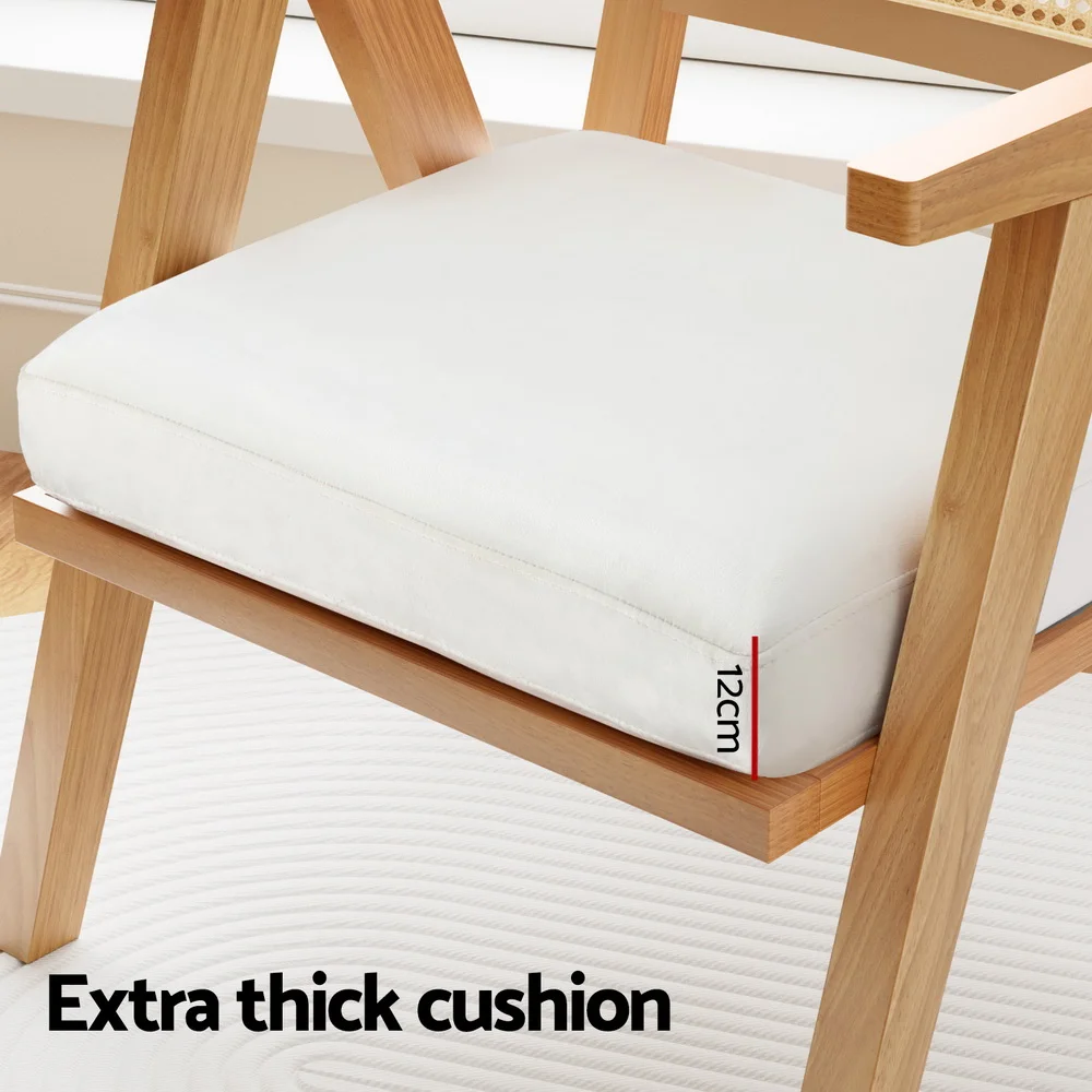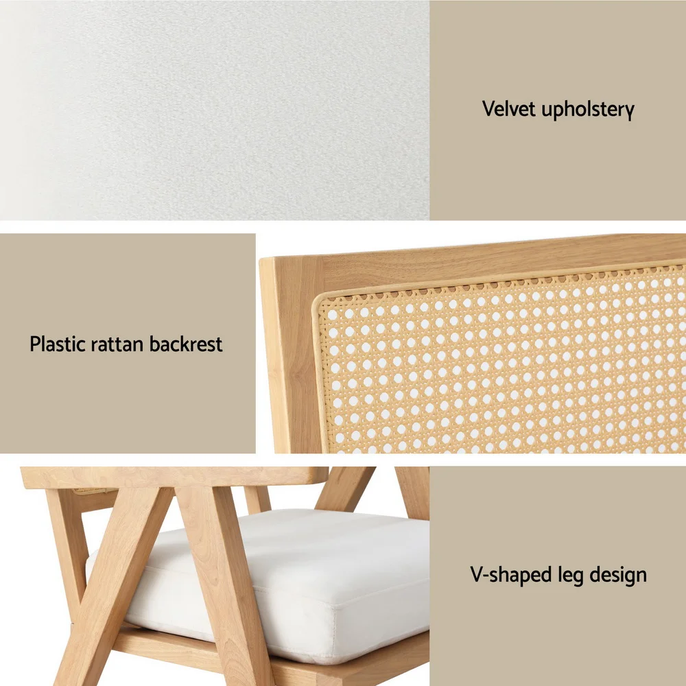 The Artiss Armchair features velvet upholstery and a unique plastic rattan backrest. Its rubberwood frame ensures durability, while the extra-thick cushion and high-resilience foam provide comfort. The V-shaped leg design adds a stylish touch, and it's designed for quick and simple setup.
