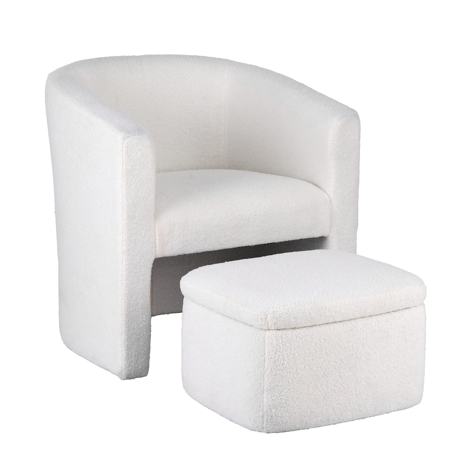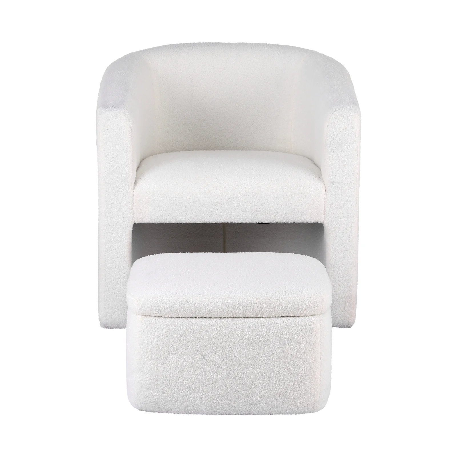 Elevate your home with this boucle chair set, perfect for modern aesthetics and cozy spaces. Upholstered in premium boucle fabric, this chair ensures softness and durability. The thick foam padding, paired with pull-out ottoman, offers unmatched comfort for lounging. Lift the ottoman to reveal a generous storage space for blankets, books, toys and more. With a weight capacity of 150kg and no assembly required, this armchair set is ideal for any living room, bedroom, or backyard. The versatile ottoman can be used as a footrest, additional seat, or side table, making it a practical yet stylish addition. Upgrade your living room or nursery today!