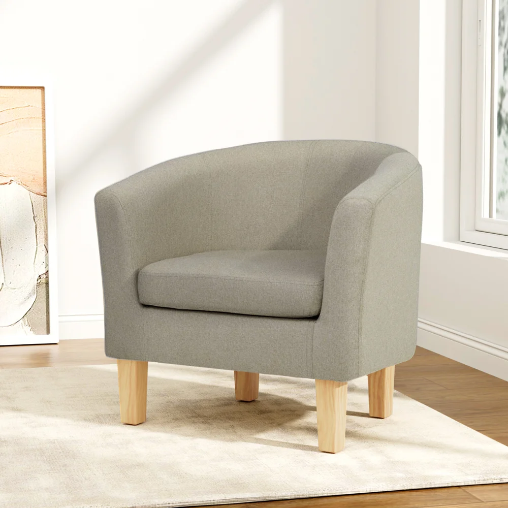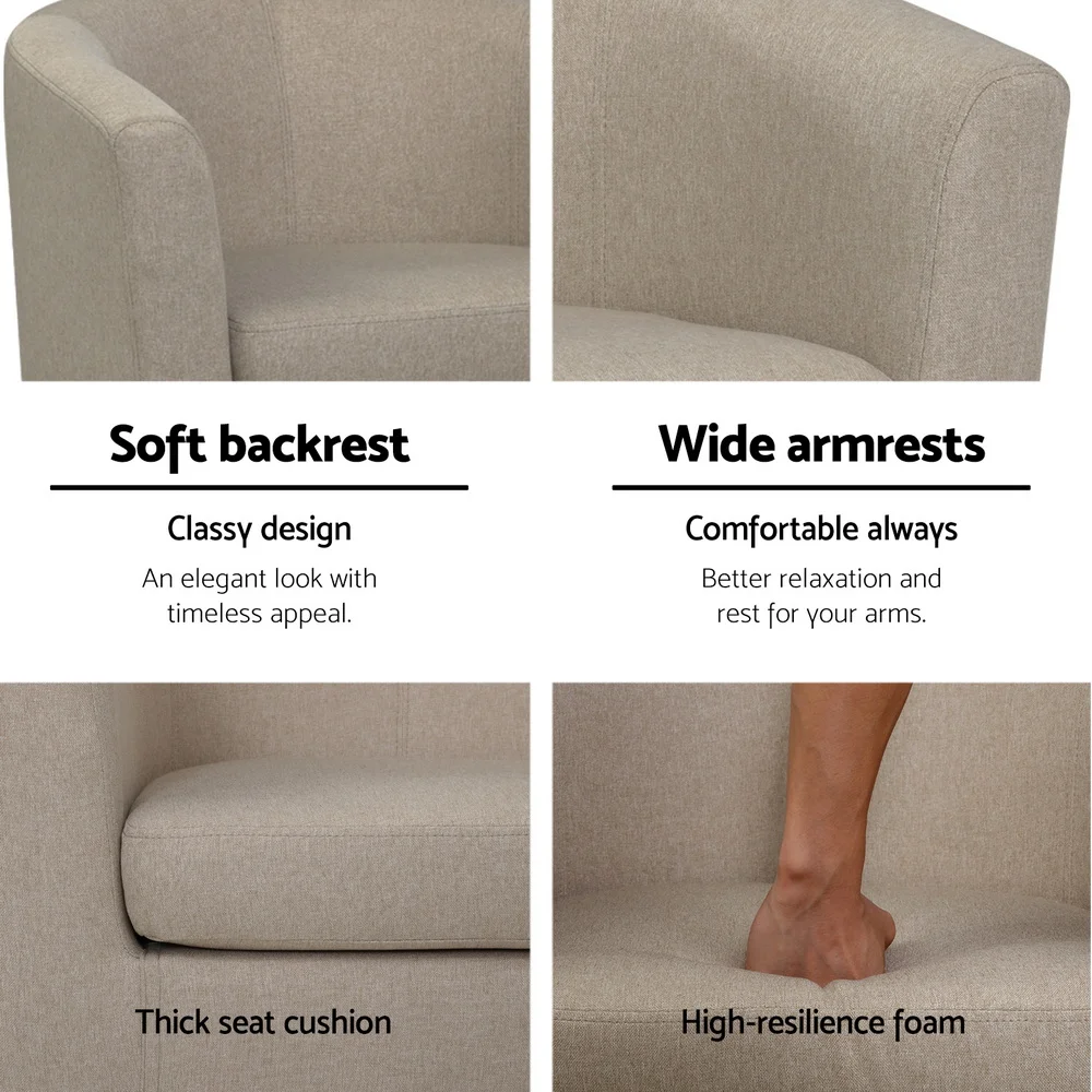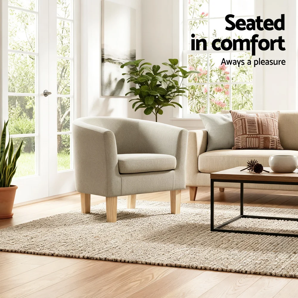 Sophistication extraordinaire. Timeless appeal. The Artiss Abby Armchair is the epitome of modernistic style with its clean lines and simple profile. Upholstered in faux linen fabric, the Abby Armchair is a full size chair with generous seating space. The extra thick foam padding ensures ultimate comfort with exceptional support while the contoured backrest feels ever so elegant and smooth. Together with a reinforced wooden frame and sturdy rubber wood legs, the Abby Armchair is guaranteed to stand up to durable use for many years to come. Not least, with its neutral beige hues, the Abby Armchair is a seamless match for any home décor. Don't settle for any armchair in your home. Make it an Artiss Abby Armchair and experience the elegant chic that it can add to your discerning lifestyle.