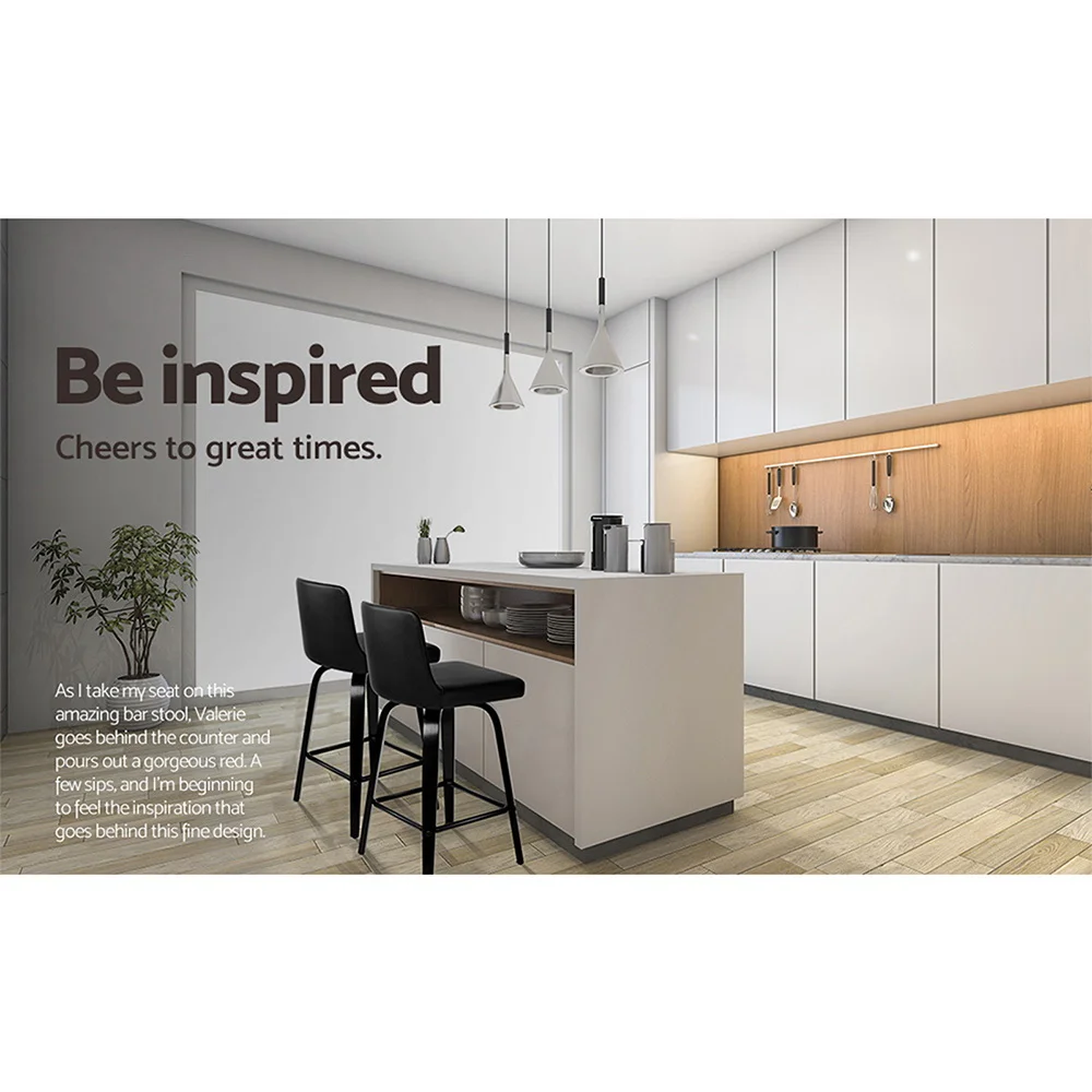 Wood, metal and deluxe PU leather are a match made in furniture heaven. Meticulously crafted using solid plywood with a stunning black finish for the frame, these bar stoolls feature a generous 6cm thick faux leather seat that swivels 360 degrees, and a padded backrest that makes the person sitting perch in total comfort.