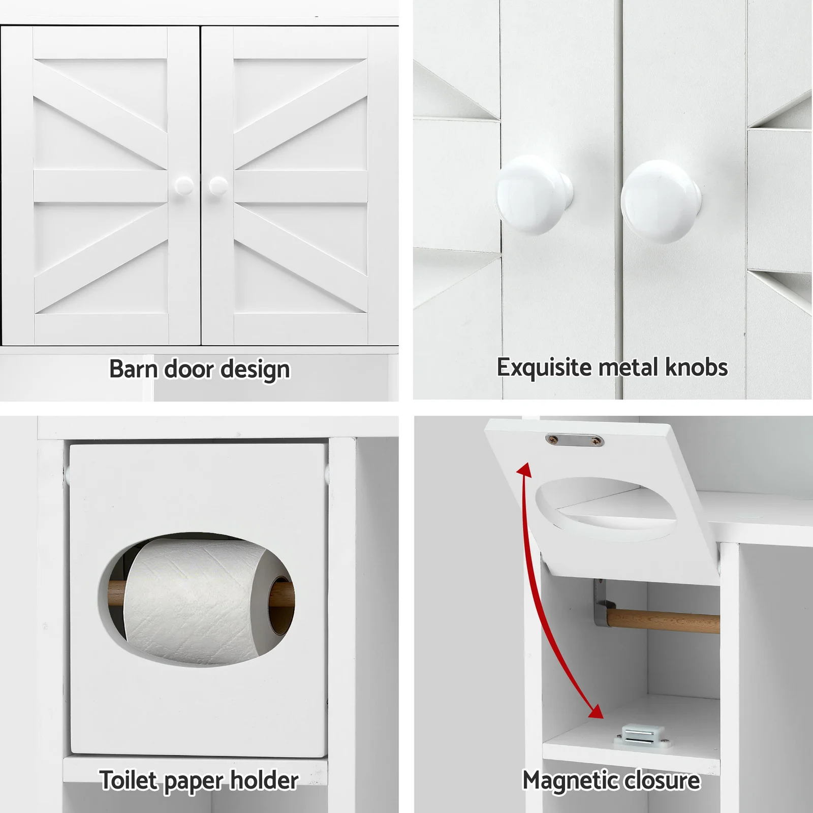 Transform your bathroom with this over-toilet storage cabinet, the perfect solution for utilizing wasted space. Designed with a barn door for a rustic touch and 6 open compartments, it's both functional and stylish. The adjustable shelf allows you to customize storage for tall bottles or smaller items. Built with a durable particle board frame and equipped with an anti-tip kit, it ensures safety and stability. The integrated toilet paper holder with magnetic closure adds convenience to your daily routine. Easy to assemble and clean, this cabinet is an ideal addition to bathrooms of any size.
