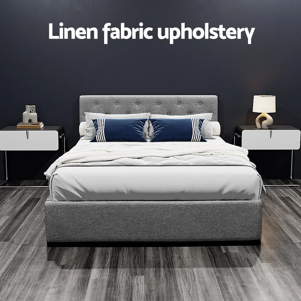 From the outside, our contemporary Artiss Vila Gas Lift Bed Frame looks absolutely plush. The premium linen fabric tufted headboard and sides all exudes fine craftsmanship. But there’s more to this luxurious bed frame than meets the eye. Lift up the frame and you will find acres of storage space under the wooden arched slat base. The gas lift system certainly helps to free up existing space in your storage cabinets for other household things.The wooden arched slat base is also designed to flex appropriately so that it can better distribute the weight exerted on it. As such, it helps to minimize movement disturbances created when two persons are sleeping on the bed. Overall, the bed frame is well-built with reinforced steel bars within its sturdy steel frame. Heavy-duty metal connectors keeps the frame sturdy with additional central support from an adjustable centre support beam. Enjoy your wonderful sleep in more ways than one with our innovative Artiss Vila Gas Lift Bed Frame.