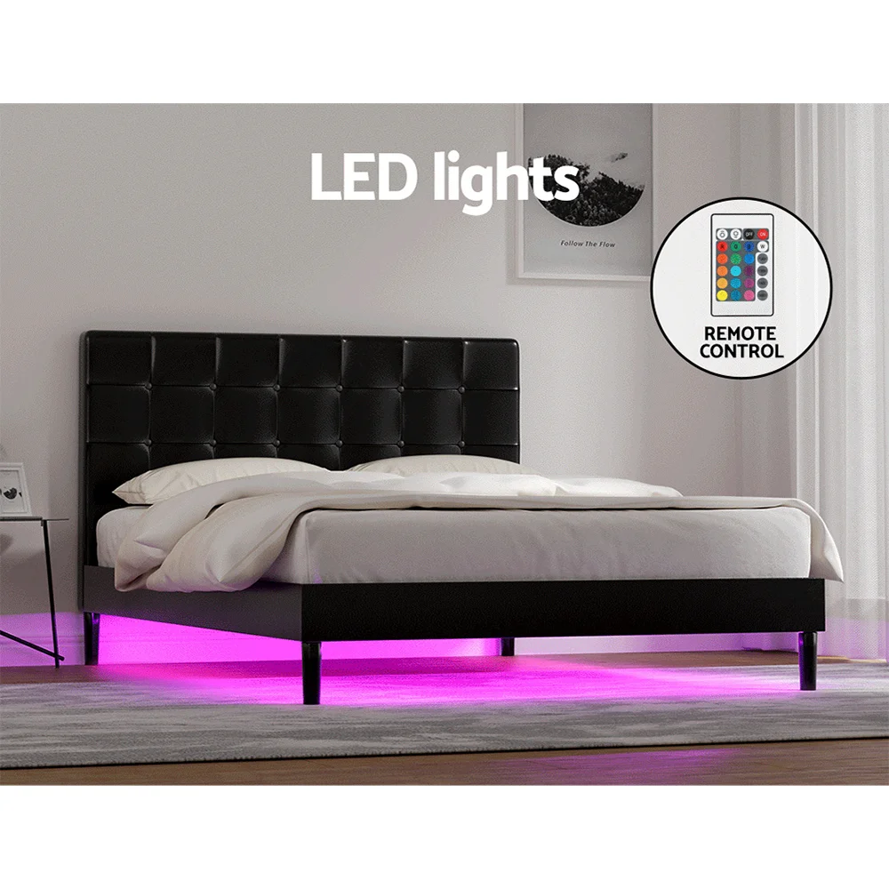 Sleep in style with our Artiss RAVI Bed Frame. Wrapped in premium PVC leather, the bed frame is aesthetically pleasing and extremely pleasant and smooth to the touch. The classic buttoned bedhead design is padded with thick high-density foam which makes it the perfect spot to sit back and relax, watch a movie, or read a book. This bed frame has premium heavy-duty metal fixings, strong centre support beams and solid powder-coated steel legs, so you don't have to worry about stability. The wide wooden slatted base provides a sturdy foundation and allows for proper ventilation for a fresh and dry mattress always. The built-in LED light strip allows you to create the perfect ambience with 16 LED colours, four flashing modes and a convenient remote control. The frame also features convenient USB and Type-C charging ports to ensure your devices are always ready to go. The bed frame is available in double, king and queen sizes and fits Australian standard-size mattresses. Experience the sweetest dreams with the Artiss RAVI Bed Frame today.