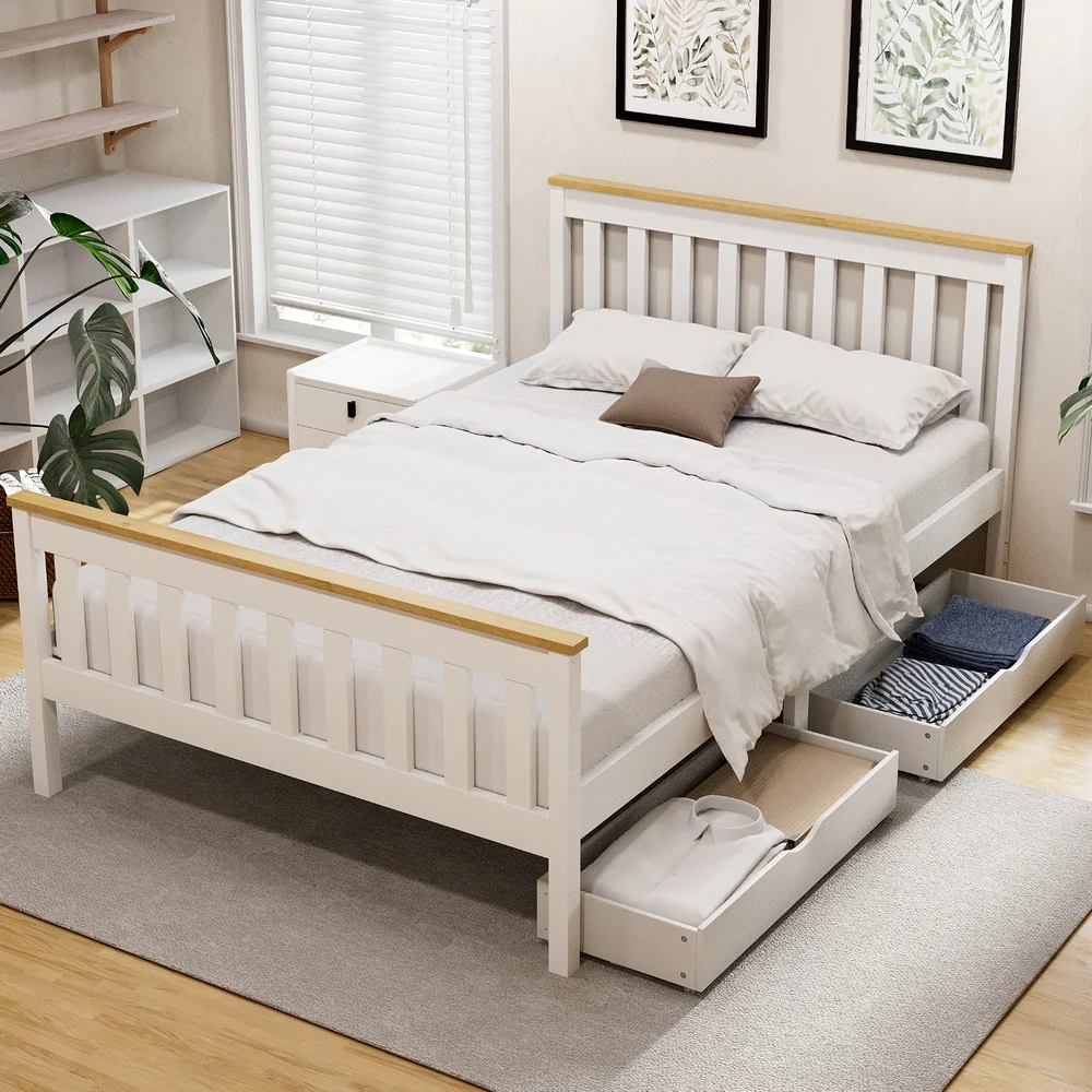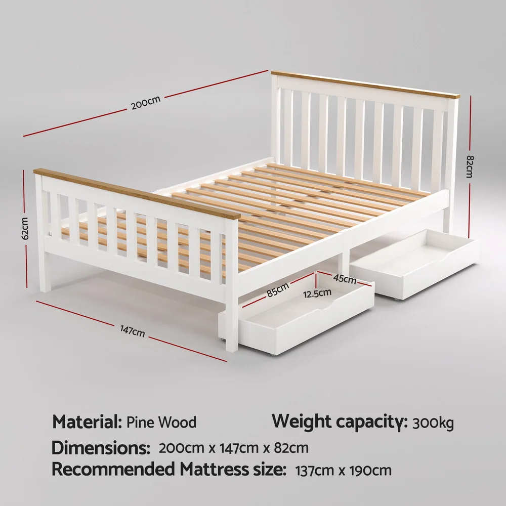 Featuring an exclusive classic design, our Pony Wooden Bed Frame is all about total simplicity with absolute practicality. Constructed of solid pine wood, the bed frame features quality plywood slats smooth finished edges, heavy-duty steel fixings and reinforced bracket support across the frame that cheaper alternatives do not provide. Not least, the two-tone colour adds an elegant and stylish look that will go well with any adult or children use.The bed frame with two storage drawers provides additional space for storing bedding essentials.