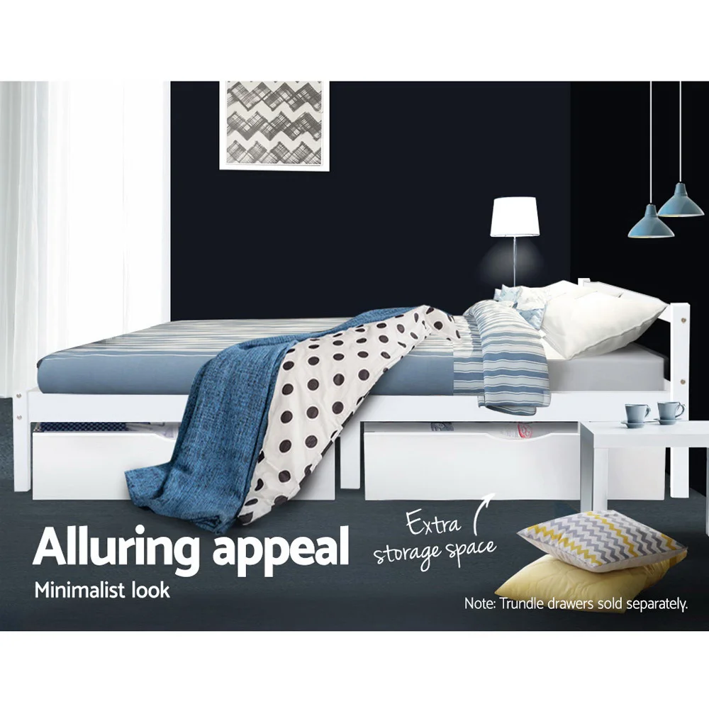 Strong and sturdy, the Bed Frame comes with a durable plywood slated base, reinforced angled brackets for long term support, stylish headboard, heavy-duty steel fixings and smooth edges all round. Finished in a non-toxic, eco-friendly white paint, the neutral-coloured Bed Frame makes for easy dcor coordination with any bedroom. Better still, the Bed Frame also has ample space below to fit in a pair of optional trundle drawers for extra storage of bedding essentials.