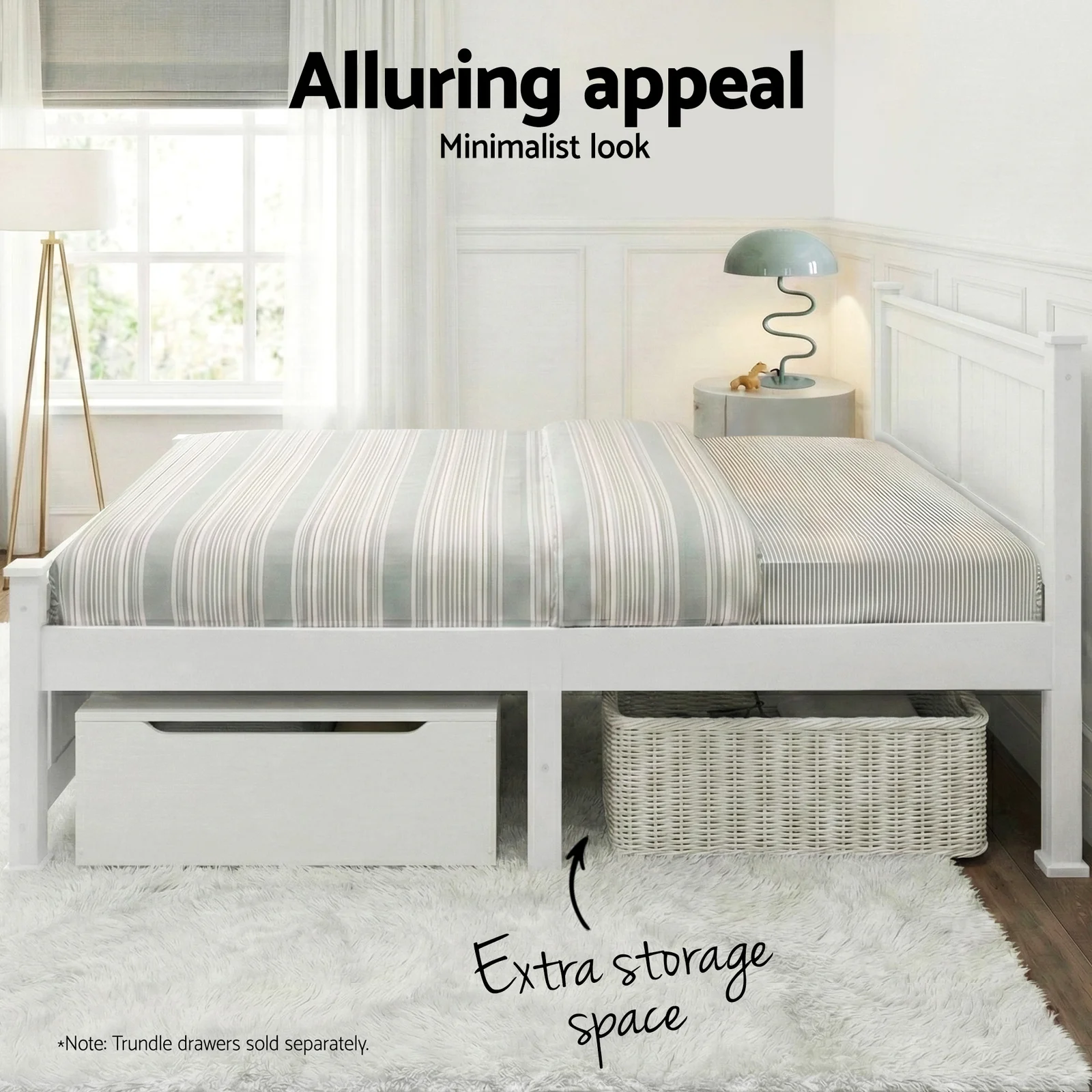 Strong and sturdy, the Bed Frame comes with a durable plywood slated base, reinforced angled brackets for long term support, stylish headboard, heavy-duty steel fixings and smooth edges all round. Finished in a non-toxic, eco-friendly white paint, the neutral-coloured Bed Frame makes for easy décor coordination with any bedroom. Better still, the Bed Frame also has ample space below to fit in a pair of optional trundle drawers for extra storage of bedding essentials.