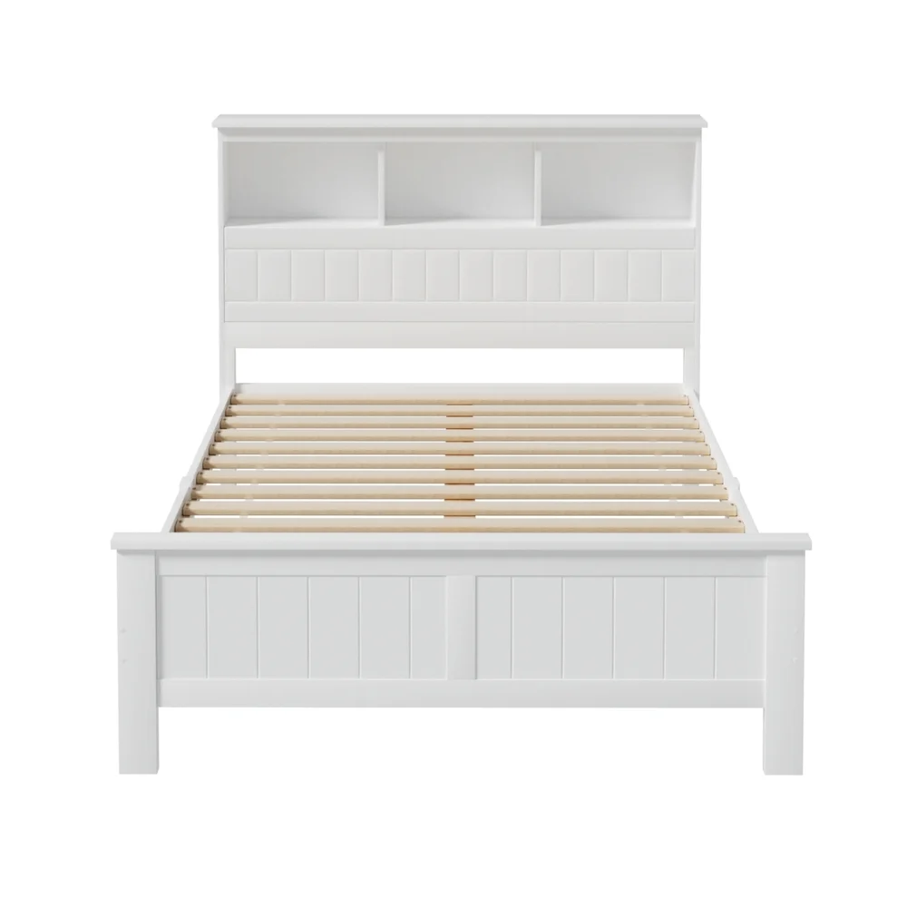 Made of natural pine wood, the Artiss Conqueror Bed Frame is ideal for kids as it for any adult. Strong and sturdy, the bed frame comes with a solid plywood slated base, reinforced supports across the frame, heavy-duty steel fixings and smooth edges all round. Finished in a non-toxic, eco-friendly white paint, the neutral coloured bed frame is also very practical with ample storage from a headboard that comprises three open compartments and a closed shelf that folds down as well as more room beneath the bed frame for optional trundle drawers or any storage boxes. Fact it, this charming bed frame is designed to please in more ways than one.