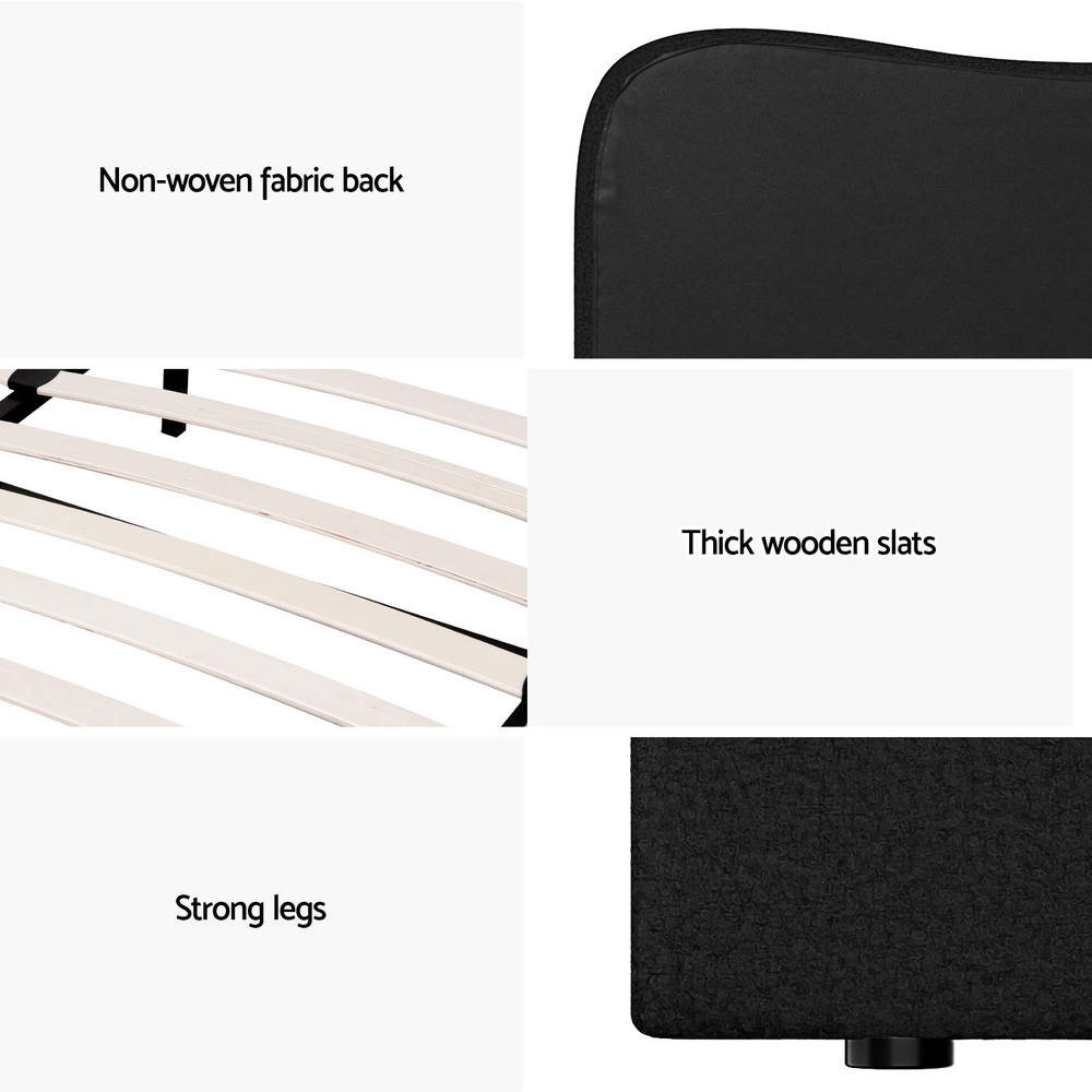 Introducing our elegant Artiss bed frame: upholstered in boucle fabric, featuring wooden frame with slat support, padded headboard, smooth edge finish, and sturdy metal connectors for a blend of style and functionality in your bedroom.FeaturesUpholstered in boucle fabricWooden frame with slat supportPadded headboardSmooth edge finishSturdy metal connectors*Note: Actual colours may vary due to lighting and screen differences.Specifications:Brand: ArtissSize: King SingleFrame material: Pine woodUpholstery material: Boucle fabricPadding material: FoamSlat material: PlywoodLeg material: PlasticOverall dimensions: 217cm x 115cm x 92.5cmStorage height: 26cmWeight capacity: 180KGColour: BlackAssembly required: YesNo. of packages: 3Package ContentArtiss DARA Bed Frame x 1Assembly Manual x 1This product comes with 1 year warranty
