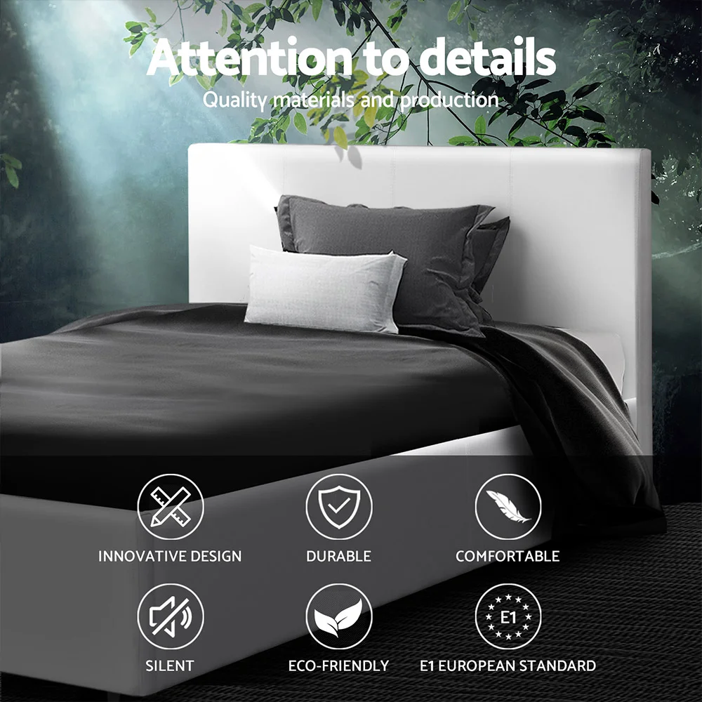 Give your bed a touch of modernistic appeal with our Artiss Neo Bed Frame. Wrapped in premium PVC leather, the bed frame is at once smooth to the touch and luxurious all round. The bedhead provides ample space for a relaxing back rest when you need to sit up on the bed to read, surf the net or catch a movie on your device. You will surely appreciate the high-density foam that fills the bedhead and every other inch of the bed frame for a well-padded look and feel. Within the frame, a highly flexible wooden arched slat base allows the bed to flex properly so that a person who lies on the bed can move around without unduly disturbing the other. Not least, the sturdy wooden frame is also held together by heavy-duty metal connectors so that you never have to worry about the stability or durability of the bed frame. If elegant sleep is what you after, look no further than the Artiss Neo Bed Frame to make your dreams come true.
