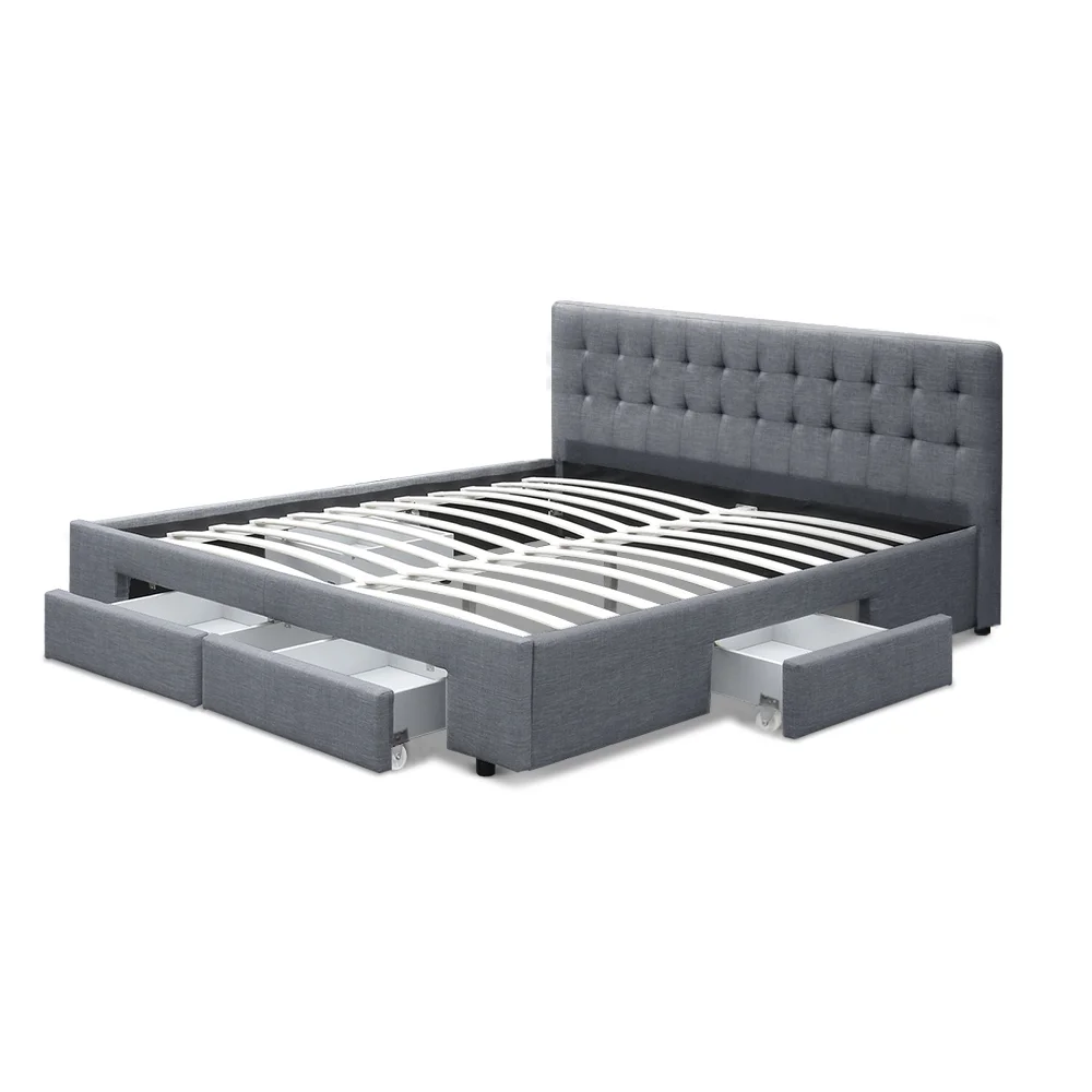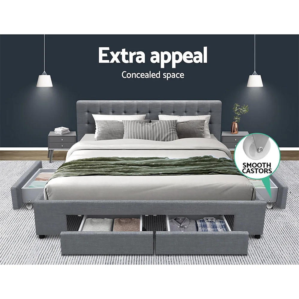 Of particular interest is the tufted headboard that really gives the Bed Frame a designer-class status. Simply oozing with elegance and sophistication in every detail. What's more, underneath the Bed Frame, you'll find four spacious drawers to store all your seasonal beddings and linen and a host of other personal essentials. No more clutter and loads of useable storage right under you. Better still, the drawers are set on wheels for easy access sliding in and out.