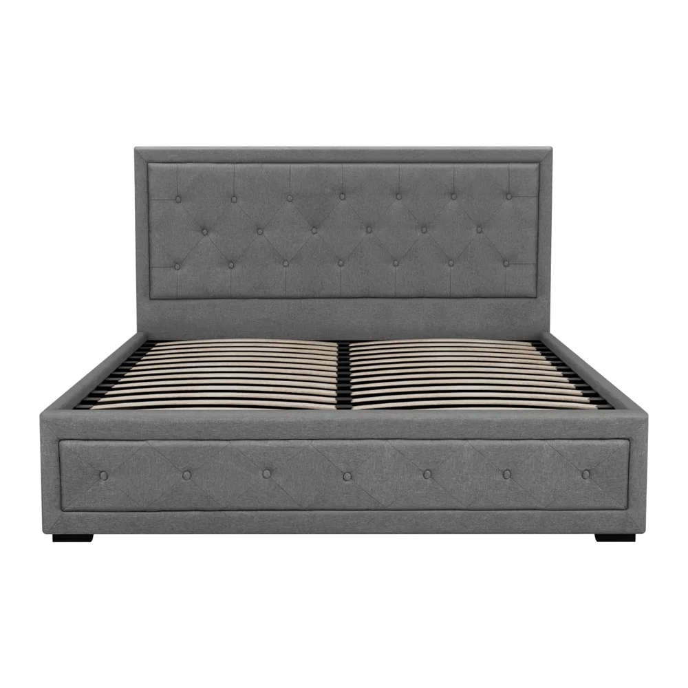 From first glance, our contemporary Artiss Tiyo Gas Lift Bed Frame looks phenomenal. The premium faux linen tufted headboard and sides all exude fine craftsmanship and luxury. But there is more. Lift up the bed base and you will find ample storage space under the wooden arched slat base. The gas lift system and hand strap enable you to effortlessly lift the bed to store items you wish to hide away until a later date. The wooden arched slat base is also designed to flex appropriately so that it can better distribute the weight exerted on it and stop disturbances in the night if your partner likes to move about. Enjoy your wonderful sleep in more ways than one with our innovative Tiyo Gas Lift Bed Frame, it is definitely brains and beauty!