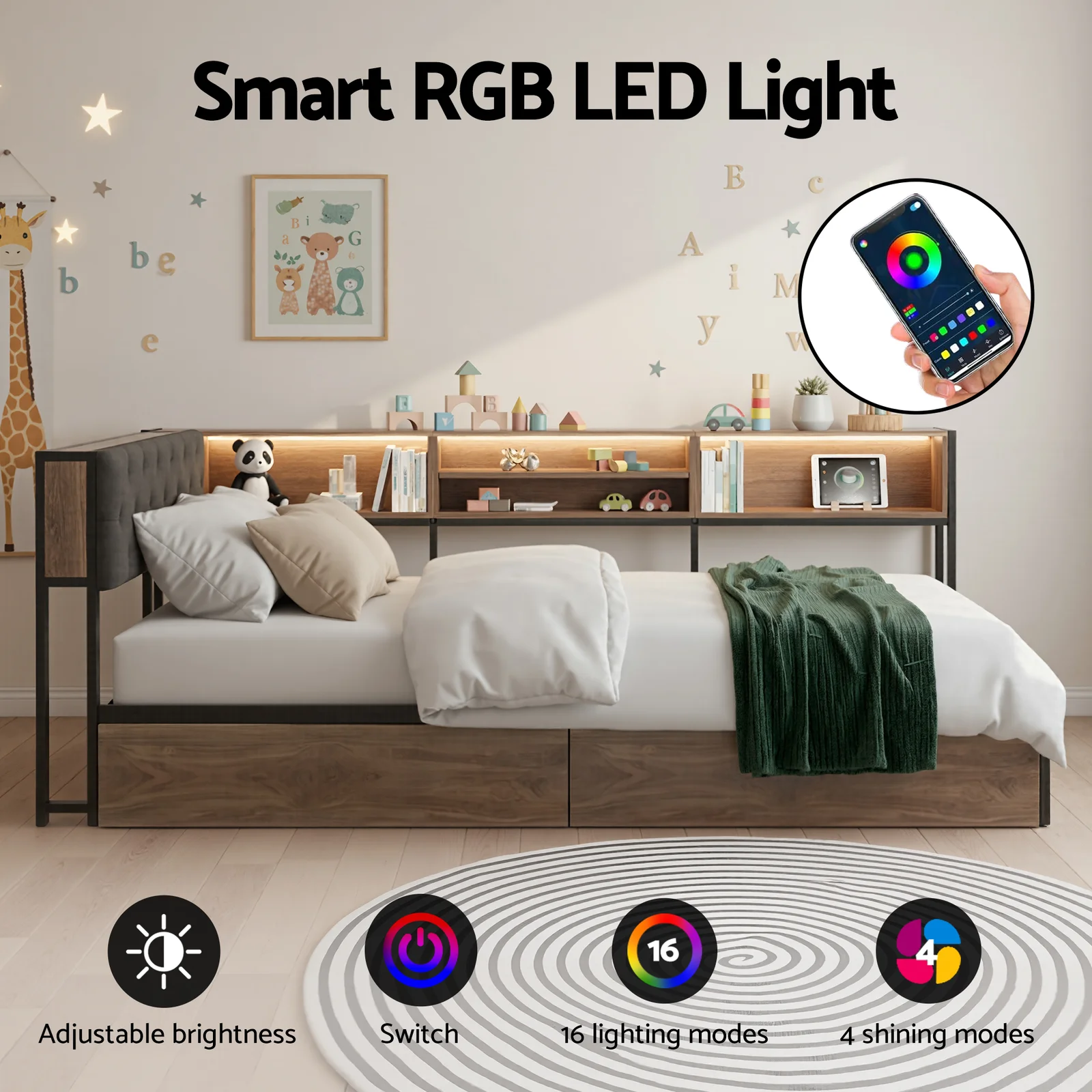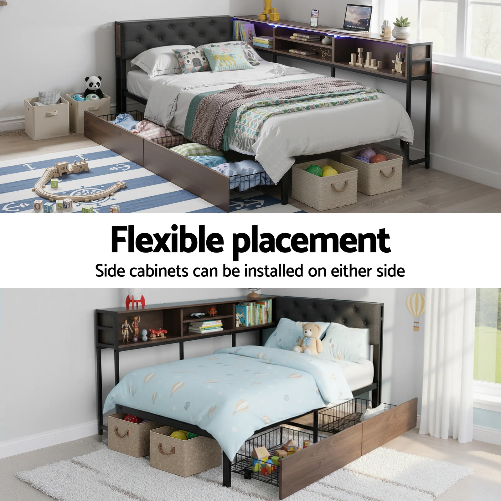 Crafted to create the ultimate cozy and functional space, this versatile bed collection combines smart design with superior comfort. The cornerstone is an L-shaped semi-enclosed corner bed featuring a plush upholstered headboard, perfect for comfortable lounging. It seamlessly integrates with a bookcase headboard and side shelves, providing practical storage solutions to calm clutter. For modern convenience, some frames are equipped with a built-in charging station at the headboard, offering AC outlets, USB, and Type-C ports. You can also elevate the ambiance with a smart LED platform bed frame, controllable for colors, brightness, and light patterns. Every frame is engineered for lasting stability with a sturdy metal construction and heavy-duty slats, supporting up to 180kg without springs. Maximizing utility, the design includes two large-capacity underneath storage drawers that glide smoothly on silent rollers, offering discreet and easy access to your belongings.