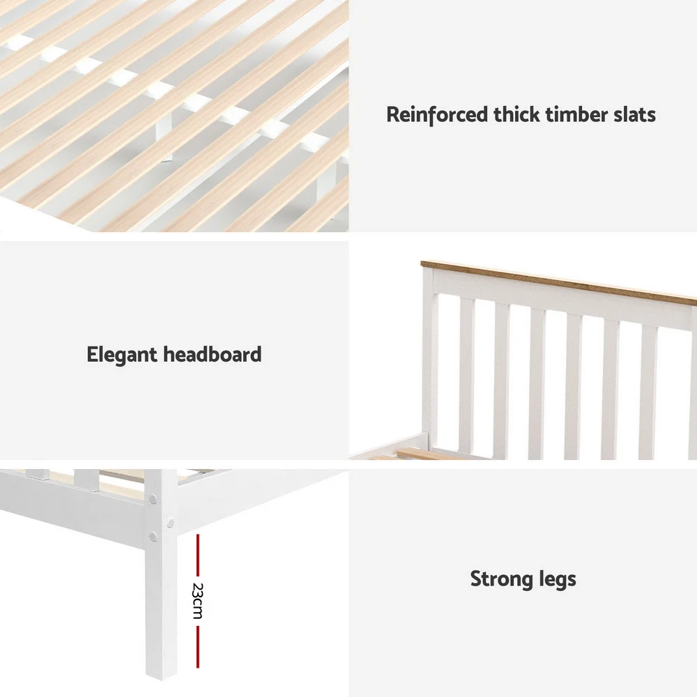 Featuring an exclusive classic design, our Pony Wooden Bed Frame is all about total simplicity with absolute practicality. Constructed of solid pine wood, the bed frame features quality plywood slats smooth finished edges, heavy-duty steel fixings and reinforced bracket support across the frame that cheaper alternatives do not provide. Not least, the two-tone colour adds an elegant and stylish look that will go well with any adult or children use.The bed frame with two storage drawers provides additional space for storing bedding essentials.