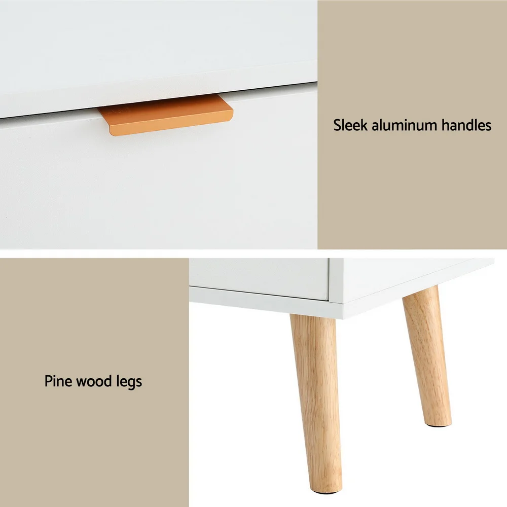 Crafted from durable particle board, this Artiss bedside table boasts ample storage with two spacious drawers, adorned with sleek aluminium handles. Supported by sturdy pine wood legs, it's easy to assemble and maintain, complete with floor protectors.