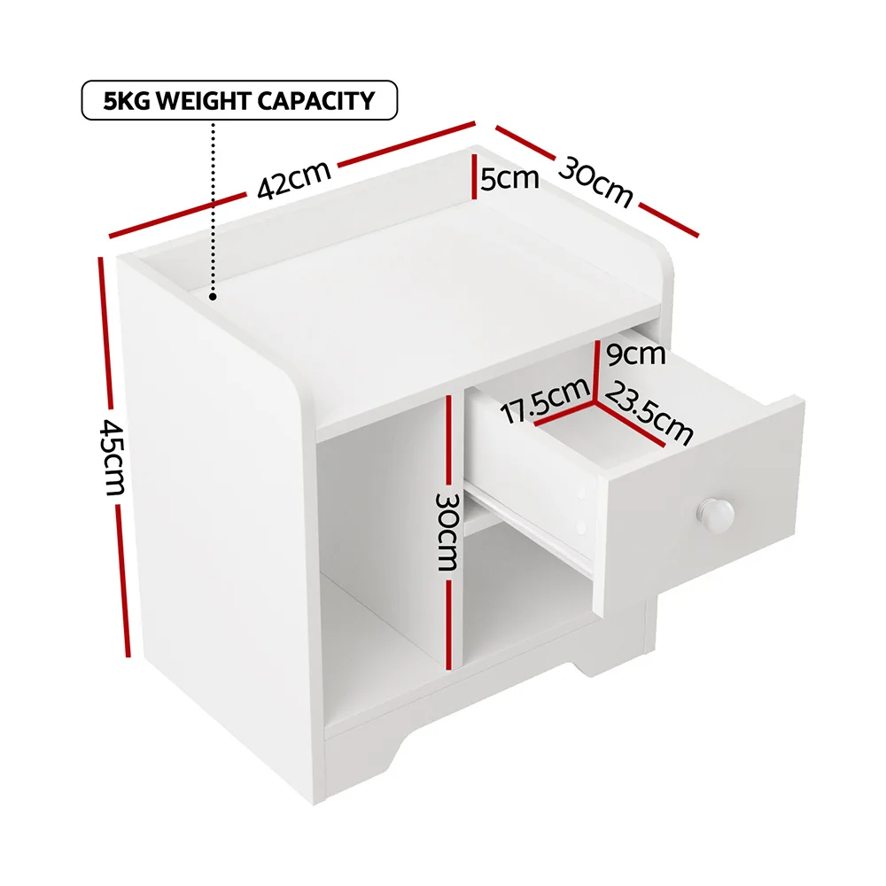 Crafted from durable E1 particle board, this Artiss bedside table boasts ample storage with two open shelves and one drawer, adorned with sleek metal knob. The easy-clean surfaces resist stains, perfect for busy households.It effortlessly fits into living rooms, lounges, bedrooms, or studio apartments.